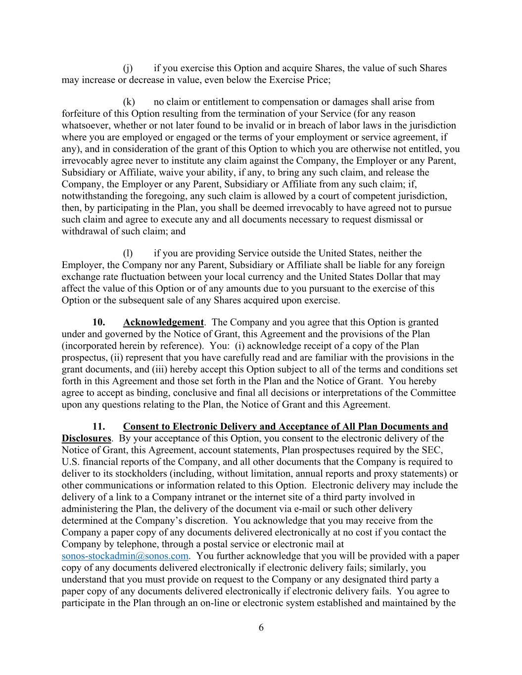 (j) if you exercise this Option and acquire Shares, the value of such Shares may increase or decrease in value, even below the Exercise Price; (k) no claim or entitlement to compensation or damages shall arise from forfeiture of this Option resulting from the termination of your Service (for any reason whatsoever, whether or not later found to be invalid or in breach of labor laws in the jurisdiction where you are employed or engaged or the terms of your employment or service agreement, if any), and in consideration of the grant of this Option to which you are otherwise not entitled, you irrevocably agree never to institute any claim against the Company, the Employer or any Parent, Subsidiary or Affiliate, waive your ability, if any, to bring any such claim, and release the Company, the Employer or any Parent, Subsidiary or Affiliate from any such claim; if, notwithstanding the foregoing, any such claim is allowed by a court of competent jurisdiction, then, by participating in the Plan, you shall be deemed irrevocably to have agreed not to pursue such claim and agree to execute any and all documents necessary to request dismissal or withdrawal of such claim; and (l) if you are providing Service outside the United States, neither the Employer, the Company nor any Parent, Subsidiary or Affiliate shall be liable for any foreign exchange rate fluctuation between your local currency and the United States Dollar that may affect the value of this Option or of any amounts due to you pursuant to the exercise of this Option or the subsequent sale of any Shares acquired upon exercise. 10. Acknowledgement. The Company and you agree that this Option is granted under and governed by the Notice of Grant, this Agreement and the provisions of the Plan (incorporated herein by reference). You: (i) acknowledge receipt of a copy of the Plan prospectus, (ii) represent that you have carefully read and are familiar with the provisions in the grant documents, and (iii) hereby accept this Option subject to all of the terms and conditions set forth in this Agreement and those set forth in the Plan and the Notice of Grant. You hereby agree to accept as binding, conclusive and final all decisions or interpretations of the Committee upon any questions relating to the Plan, the Notice of Grant and this Agreement. 11. Consent to Electronic Delivery and Acceptance of All Plan Documents and Disclosures. By your acceptance of this Option, you consent to the electronic delivery of the Notice of Grant, this Agreement, account statements, Plan prospectuses required by the SEC, U.S. financial reports of the Company, and all other documents that the Company is required to deliver to its stockholders (including, without limitation, annual reports and proxy statements) or other communications or information related to this Option. Electronic delivery may include the delivery of a link to a Company intranet or the internet site of a third party involved in administering the Plan, the delivery of the document via e-mail or such other delivery determined at the Company’s discretion. You acknowledge that you may receive from the Company a paper copy of any documents delivered electronically at no cost if you contact the Company by telephone, through a postal service or electronic mail at sonos-stockadmin@sonos.com. You further acknowledge that you will be provided with a paper copy of any documents delivered electronically if electronic delivery fails; similarly, you understand that you must provide on request to the Company or any designated third party a paper copy of any documents delivered electronically if electronic delivery fails. You agree to participate in the Plan through an on-line or electronic system established and maintained by the 6