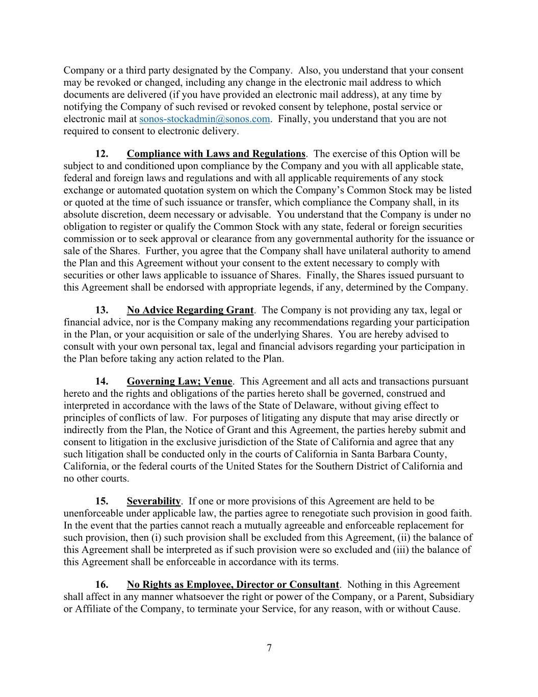 Company or a third party designated by the Company. Also, you understand that your consent may be revoked or changed, including any change in the electronic mail address to which documents are delivered (if you have provided an electronic mail address), at any time by notifying the Company of such revised or revoked consent by telephone, postal service or electronic mail at sonos-stockadmin@sonos.com. Finally, you understand that you are not required to consent to electronic delivery. 12. Compliance with Laws and Regulations. The exercise of this Option will be subject to and conditioned upon compliance by the Company and you with all applicable state, federal and foreign laws and regulations and with all applicable requirements of any stock exchange or automated quotation system on which the Company’s Common Stock may be listed or quoted at the time of such issuance or transfer, which compliance the Company shall, in its absolute discretion, deem necessary or advisable. You understand that the Company is under no obligation to register or qualify the Common Stock with any state, federal or foreign securities commission or to seek approval or clearance from any governmental authority for the issuance or sale of the Shares. Further, you agree that the Company shall have unilateral authority to amend the Plan and this Agreement without your consent to the extent necessary to comply with securities or other laws applicable to issuance of Shares. Finally, the Shares issued pursuant to this Agreement shall be endorsed with appropriate legends, if any, determined by the Company. 13. No Advice Regarding Grant. The Company is not providing any tax, legal or financial advice, nor is the Company making any recommendations regarding your participation in the Plan, or your acquisition or sale of the underlying Shares. You are hereby advised to consult with your own personal tax, legal and financial advisors regarding your participation in the Plan before taking any action related to the Plan. 14. Governing Law; Venue. This Agreement and all acts and transactions pursuant hereto and the rights and obligations of the parties hereto shall be governed, construed and interpreted in accordance with the laws of the State of Delaware, without giving effect to principles of conflicts of law. For purposes of litigating any dispute that may arise directly or indirectly from the Plan, the Notice of Grant and this Agreement, the parties hereby submit and consent to litigation in the exclusive jurisdiction of the State of California and agree that any such litigation shall be conducted only in the courts of California in Santa Barbara County, California, or the federal courts of the United States for the Southern District of California and no other courts. 15. Severability. If one or more provisions of this Agreement are held to be unenforceable under applicable law, the parties agree to renegotiate such provision in good faith. In the event that the parties cannot reach a mutually agreeable and enforceable replacement for such provision, then (i) such provision shall be excluded from this Agreement, (ii) the balance of this Agreement shall be interpreted as if such provision were so excluded and (iii) the balance of this Agreement shall be enforceable in accordance with its terms. 16. No Rights as Employee, Director or Consultant. Nothing in this Agreement shall affect in any manner whatsoever the right or power of the Company, or a Parent, Subsidiary or Affiliate of the Company, to terminate your Service, for any reason, with or without Cause. 7