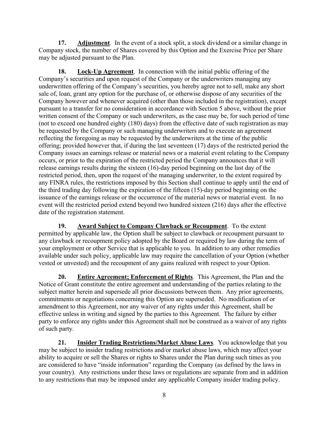 17. Adjustment. In the event of a stock split, a stock dividend or a similar change in Company stock, the number of Shares covered by this Option and the Exercise Price per Share may be adjusted pursuant to the Plan. 18. Lock-Up Agreement. In connection with the initial public offering of the Company’s securities and upon request of the Company or the underwriters managing any underwritten offering of the Company’s securities, you hereby agree not to sell, make any short sale of, loan, grant any option for the purchase of, or otherwise dispose of any securities of the Company however and whenever acquired (other than those included in the registration), except pursuant to a transfer for no consideration in accordance with Section 5 above, without the prior written consent of the Company or such underwriters, as the case may be, for such period of time (not to exceed one hundred eighty (180) days) from the effective date of such registration as may be requested by the Company or such managing underwriters and to execute an agreement reflecting the foregoing as may be requested by the underwriters at the time of the public offering; provided however that, if during the last seventeen (17) days of the restricted period the Company issues an earnings release or material news or a material event relating to the Company occurs, or prior to the expiration of the restricted period the Company announces that it will release earnings results during the sixteen (16)-day period beginning on the last day of the restricted period, then, upon the request of the managing underwriter, to the extent required by any FINRA rules, the restrictions imposed by this Section shall continue to apply until the end of the third trading day following the expiration of the fifteen (15)-day period beginning on the issuance of the earnings release or the occurrence of the material news or material event. In no event will the restricted period extend beyond two hundred sixteen (216) days after the effective date of the registration statement. 19. Award Subject to Company Clawback or Recoupment. To the extent permitted by applicable law, the Option shall be subject to clawback or recoupment pursuant to any clawback or recoupment policy adopted by the Board or required by law during the term of your employment or other Service that is applicable to you. In addition to any other remedies available under such policy, applicable law may require the cancellation of your Option (whether vested or unvested) and the recoupment of any gains realized with respect to your Option. 20. Entire Agreement; Enforcement of Rights. This Agreement, the Plan and the Notice of Grant constitute the entire agreement and understanding of the parties relating to the subject matter herein and supersede all prior discussions between them. Any prior agreements, commitments or negotiations concerning this Option are superseded. No modification of or amendment to this Agreement, nor any waiver of any rights under this Agreement, shall be effective unless in writing and signed by the parties to this Agreement. The failure by either party to enforce any rights under this Agreement shall not be construed as a waiver of any rights of such party. 21. Insider Trading Restrictions/Market Abuse Laws. You acknowledge that you may be subject to insider trading restrictions and/or market abuse laws, which may affect your ability to acquire or sell the Shares or rights to Shares under the Plan during such times as you are considered to have “inside information” regarding the Company (as defined by the laws in your country). Any restrictions under these laws or regulations are separate from and in addition to any restrictions that may be imposed under any applicable Company insider trading policy. 8