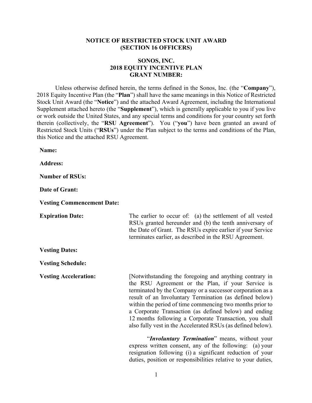 NOTICE OF RESTRICTED STOCK UNIT AWARD (SECTION 16 OFFICERS) SONOS, INC. 2018 EQUITY INCENTIVE PLAN GRANT NUMBER: Unless otherwise defined herein, the terms defined in the Sonos, Inc. (the “Company”), 2018 Equity Incentive Plan (the “Plan”) shall have the same meanings in this Notice of Restricted Stock Unit Award (the “Notice”) and the attached Award Agreement, including the International Supplement attached hereto (the “Supplement”), which is generally applicable to you if you live or work outside the United States, and any special terms and conditions for your country set forth therein (collectively, the “RSU Agreement”). You (“you”) have been granted an award of Restricted Stock Units (“RSUs”) under the Plan subject to the terms and conditions of the Plan, this Notice and the attached RSU Agreement. Name: Address: Number of RSUs: Date of Grant: Vesting Commencement Date: Expiration Date: The earlier to occur of: (a) the settlement of all vested RSUs granted hereunder and (b) the tenth anniversary of the Date of Grant. The RSUs expire earlier if your Service terminates earlier, as described in the RSU Agreement. Vesting Dates: Vesting Schedule: Vesting Acceleration: [Notwithstanding the foregoing and anything contrary in the RSU Agreement or the Plan, if your Service is terminated by the Company or a successor corporation as a result of an Involuntary Termination (as defined below) within the period of time commencing two months prior to a Corporate Transaction (as defined below) and ending 12 months following a Corporate Transaction, you shall also fully vest in the Accelerated RSUs (as defined below). “Involuntary Termination” means, without your express written consent, any of the following: (a) your resignation following (i) a significant reduction of your duties, position or responsibilities relative to your duties, 1