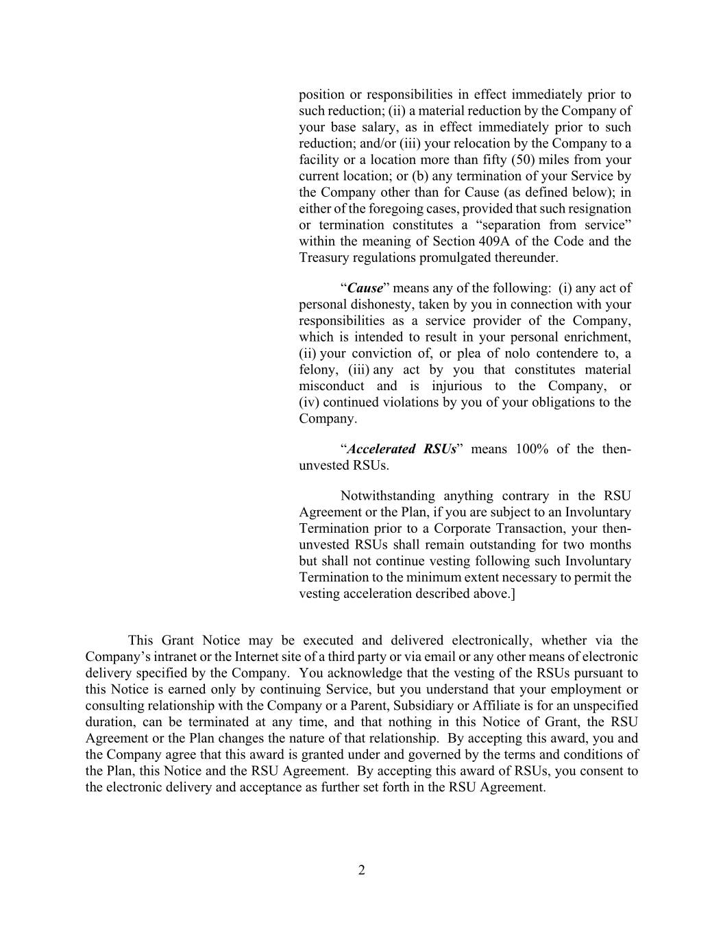 position or responsibilities in effect immediately prior to such reduction; (ii) a material reduction by the Company of your base salary, as in effect immediately prior to such reduction; and/or (iii) your relocation by the Company to a facility or a location more than fifty (50) miles from your current location; or (b) any termination of your Service by the Company other than for Cause (as defined below); in either of the foregoing cases, provided that such resignation or termination constitutes a “separation from service” within the meaning of Section 409A of the Code and the Treasury regulations promulgated thereunder. “Cause” means any of the following: (i) any act of personal dishonesty, taken by you in connection with your responsibilities as a service provider of the Company, which is intended to result in your personal enrichment, (ii) your conviction of, or plea of nolo contendere to, a felony, (iii) any act by you that constitutes material misconduct and is injurious to the Company, or (iv) continued violations by you of your obligations to the Company. “Accelerated RSUs” means 100% of the then- unvested RSUs. Notwithstanding anything contrary in the RSU Agreement or the Plan, if you are subject to an Involuntary Termination prior to a Corporate Transaction, your then- unvested RSUs shall remain outstanding for two months but shall not continue vesting following such Involuntary Termination to the minimum extent necessary to permit the vesting acceleration described above.] This Grant Notice may be executed and delivered electronically, whether via the Company’s intranet or the Internet site of a third party or via email or any other means of electronic delivery specified by the Company. You acknowledge that the vesting of the RSUs pursuant to this Notice is earned only by continuing Service, but you understand that your employment or consulting relationship with the Company or a Parent, Subsidiary or Affiliate is for an unspecified duration, can be terminated at any time, and that nothing in this Notice of Grant, the RSU Agreement or the Plan changes the nature of that relationship. By accepting this award, you and the Company agree that this award is granted under and governed by the terms and conditions of the Plan, this Notice and the RSU Agreement. By accepting this award of RSUs, you consent to the electronic delivery and acceptance as further set forth in the RSU Agreement. 2
