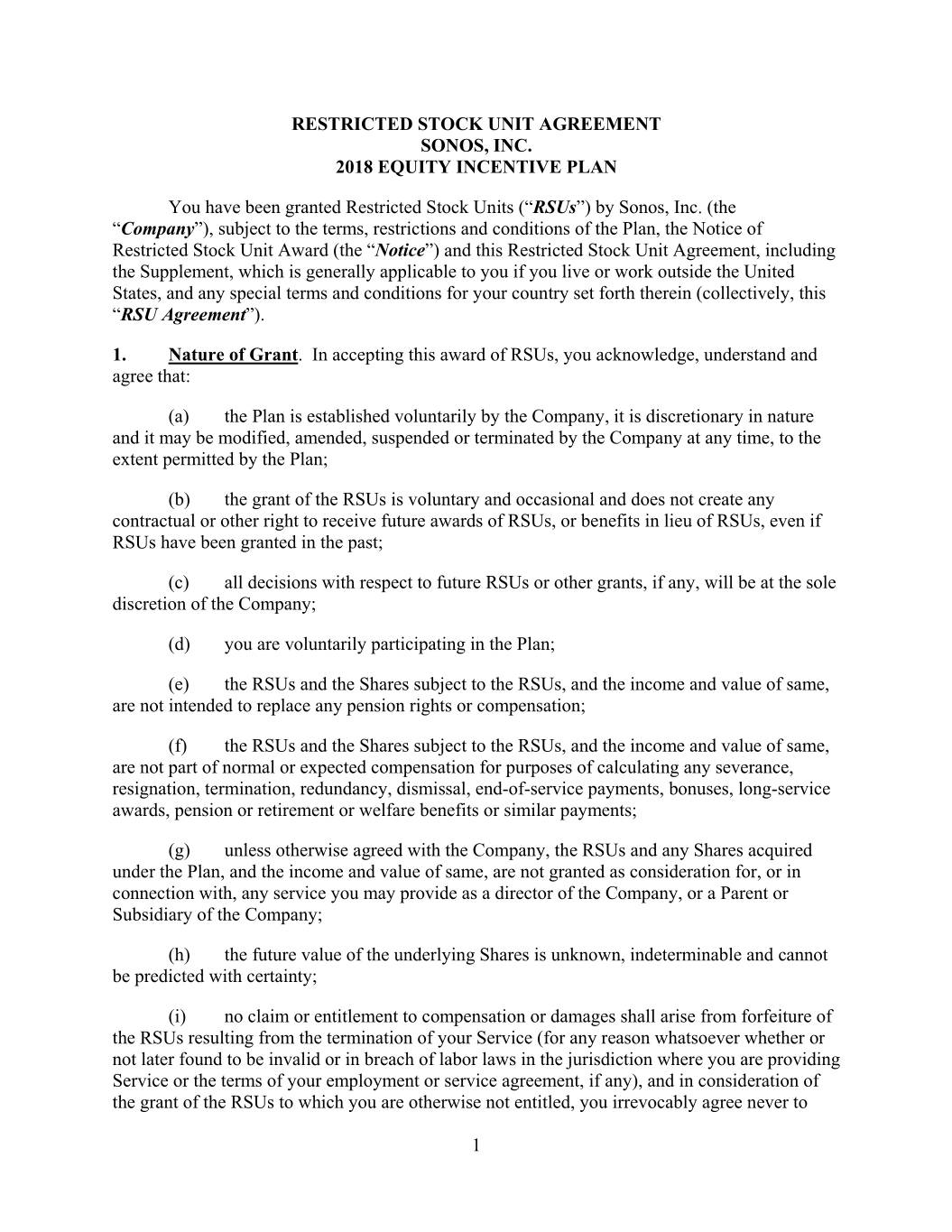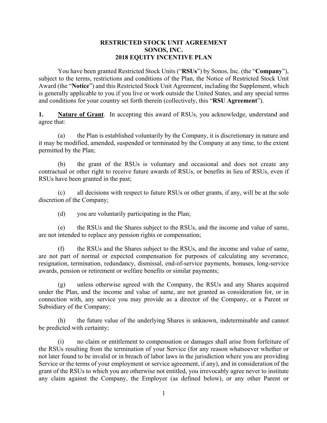 RESTRICTED STOCK UNIT AGREEMENT SONOS, INC. 2018 EQUITY INCENTIVE PLAN You have been granted Restricted Stock Units (“RSUs”) by Sonos, Inc. (the “Company”), subject to the terms, restrictions and conditions of the Plan, the Notice of Restricted Stock Unit Award (the “Notice”) and this Restricted Stock Unit Agreement, including the Supplement, which is generally applicable to you if you live or work outside the United States, and any special terms and conditions for your country set forth therein (collectively, this “RSU Agreement”). 1. Nature of Grant. In accepting this award of RSUs, you acknowledge, understand and agree that: (a) the Plan is established voluntarily by the Company, it is discretionary in nature and it may be modified, amended, suspended or terminated by the Company at any time, to the extent permitted by the Plan; (b) the grant of the RSUs is voluntary and occasional and does not create any contractual or other right to receive future awards of RSUs, or benefits in lieu of RSUs, even if RSUs have been granted in the past; (c) all decisions with respect to future RSUs or other grants, if any, will be at the sole discretion of the Company; (d) you are voluntarily participating in the Plan; (e) the RSUs and the Shares subject to the RSUs, and the income and value of same, are not intended to replace any pension rights or compensation; (f) the RSUs and the Shares subject to the RSUs, and the income and value of same, are not part of normal or expected compensation for purposes of calculating any severance, resignation, termination, redundancy, dismissal, end-of-service payments, bonuses, long-service awards, pension or retirement or welfare benefits or similar payments; (g) unless otherwise agreed with the Company, the RSUs and any Shares acquired under the Plan, and the income and value of same, are not granted as consideration for, or in connection with, any service you may provide as a director of the Company, or a Parent or Subsidiary of the Company; (h) the future value of the underlying Shares is unknown, indeterminable and cannot be predicted with certainty; (i) no claim or entitlement to compensation or damages shall arise from forfeiture of the RSUs resulting from the termination of your Service (for any reason whatsoever whether or not later found to be invalid or in breach of labor laws in the jurisdiction where you are providing Service or the terms of your employment or service agreement, if any), and in consideration of the grant of the RSUs to which you are otherwise not entitled, you irrevocably agree never to institute any claim against the Company, the Employer (as defined below), or any other Parent or 1