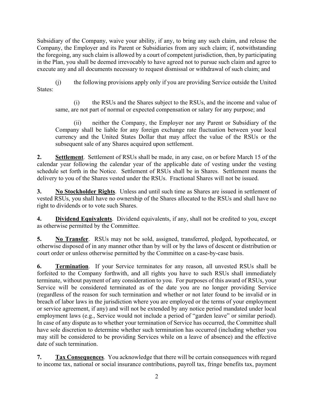 Subsidiary of the Company, waive your ability, if any, to bring any such claim, and release the Company, the Employer and its Parent or Subsidiaries from any such claim; if, notwithstanding the foregoing, any such claim is allowed by a court of competent jurisdiction, then, by participating in the Plan, you shall be deemed irrevocably to have agreed not to pursue such claim and agree to execute any and all documents necessary to request dismissal or withdrawal of such claim; and (j) the following provisions apply only if you are providing Service outside the United States: (i) the RSUs and the Shares subject to the RSUs, and the income and value of same, are not part of normal or expected compensation or salary for any purpose; and (ii) neither the Company, the Employer nor any Parent or Subsidiary of the Company shall be liable for any foreign exchange rate fluctuation between your local currency and the United States Dollar that may affect the value of the RSUs or the subsequent sale of any Shares acquired upon settlement. 2. Settlement. Settlement of RSUs shall be made, in any case, on or before March 15 of the calendar year following the calendar year of the applicable date of vesting under the vesting schedule set forth in the Notice. Settlement of RSUs shall be in Shares. Settlement means the delivery to you of the Shares vested under the RSUs. Fractional Shares will not be issued. 3. No Stockholder Rights. Unless and until such time as Shares are issued in settlement of vested RSUs, you shall have no ownership of the Shares allocated to the RSUs and shall have no right to dividends or to vote such Shares. 4. Dividend Equivalents. Dividend equivalents, if any, shall not be credited to you, except as otherwise permitted by the Committee. 5. No Transfer. RSUs may not be sold, assigned, transferred, pledged, hypothecated, or otherwise disposed of in any manner other than by will or by the laws of descent or distribution or court order or unless otherwise permitted by the Committee on a case-by-case basis. 6. Termination. If your Service terminates for any reason, all unvested RSUs shall be forfeited to the Company forthwith, and all rights you have to such RSUs shall immediately terminate, without payment of any consideration to you. For purposes of this award of RSUs, your Service will be considered terminated as of the date you are no longer providing Service (regardless of the reason for such termination and whether or not later found to be invalid or in breach of labor laws in the jurisdiction where you are employed or the terms of your employment or service agreement, if any) and will not be extended by any notice period mandated under local employment laws (e.g., Service would not include a period of “garden leave” or similar period). In case of any dispute as to whether your termination of Service has occurred, the Committee shall have sole discretion to determine whether such termination has occurred (including whether you may still be considered to be providing Services while on a leave of absence) and the effective date of such termination. 7. Tax Consequences. You acknowledge that there will be certain consequences with regard to income tax, national or social insurance contributions, payroll tax, fringe benefits tax, payment 2