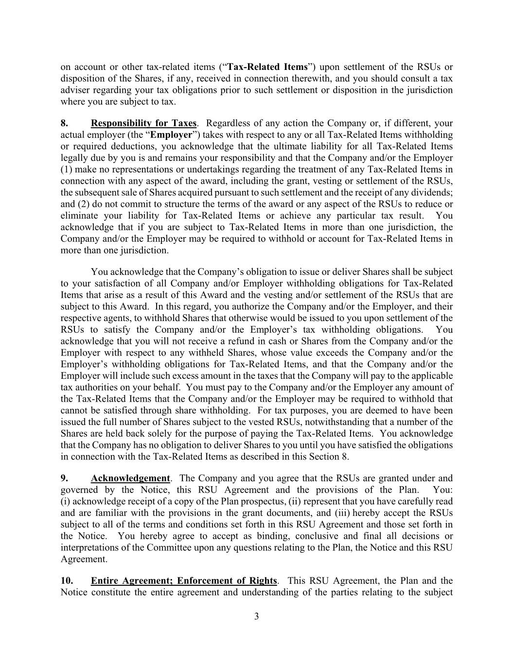 on account or other tax-related items (“Tax-Related Items”) upon settlement of the RSUs or disposition of the Shares, if any, received in connection therewith, and you should consult a tax adviser regarding your tax obligations prior to such settlement or disposition in the jurisdiction where you are subject to tax. 8. Responsibility for Taxes. Regardless of any action the Company or, if different, your actual employer (the “Employer”) takes with respect to any or all Tax-Related Items withholding or required deductions, you acknowledge that the ultimate liability for all Tax-Related Items legally due by you is and remains your responsibility and that the Company and/or the Employer (1) make no representations or undertakings regarding the treatment of any Tax-Related Items in connection with any aspect of the award, including the grant, vesting or settlement of the RSUs, the subsequent sale of Shares acquired pursuant to such settlement and the receipt of any dividends; and (2) do not commit to structure the terms of the award or any aspect of the RSUs to reduce or eliminate your liability for Tax-Related Items or achieve any particular tax result. You acknowledge that if you are subject to Tax-Related Items in more than one jurisdiction, the Company and/or the Employer may be required to withhold or account for Tax-Related Items in more than one jurisdiction. You acknowledge that the Company’s obligation to issue or deliver Shares shall be subject to your satisfaction of all Company and/or Employer withholding obligations for Tax-Related Items that arise as a result of this Award and the vesting and/or settlement of the RSUs that are subject to this Award. In this regard, you authorize the Company and/or the Employer, and their respective agents, to withhold Shares that otherwise would be issued to you upon settlement of the RSUs to satisfy the Company and/or the Employer’s tax withholding obligations. You acknowledge that you will not receive a refund in cash or Shares from the Company and/or the Employer with respect to any withheld Shares, whose value exceeds the Company and/or the Employer’s withholding obligations for Tax-Related Items, and that the Company and/or the Employer will include such excess amount in the taxes that the Company will pay to the applicable tax authorities on your behalf. You must pay to the Company and/or the Employer any amount of the Tax-Related Items that the Company and/or the Employer may be required to withhold that cannot be satisfied through share withholding. For tax purposes, you are deemed to have been issued the full number of Shares subject to the vested RSUs, notwithstanding that a number of the Shares are held back solely for the purpose of paying the Tax-Related Items. You acknowledge that the Company has no obligation to deliver Shares to you until you have satisfied the obligations in connection with the Tax-Related Items as described in this Section 8. 9. Acknowledgement. The Company and you agree that the RSUs are granted under and governed by the Notice, this RSU Agreement and the provisions of the Plan. You: (i) acknowledge receipt of a copy of the Plan prospectus, (ii) represent that you have carefully read and are familiar with the provisions in the grant documents, and (iii) hereby accept the RSUs subject to all of the terms and conditions set forth in this RSU Agreement and those set forth in the Notice. You hereby agree to accept as binding, conclusive and final all decisions or interpretations of the Committee upon any questions relating to the Plan, the Notice and this RSU Agreement. 10. Entire Agreement; Enforcement of Rights. This RSU Agreement, the Plan and the Notice constitute the entire agreement and understanding of the parties relating to the subject 3