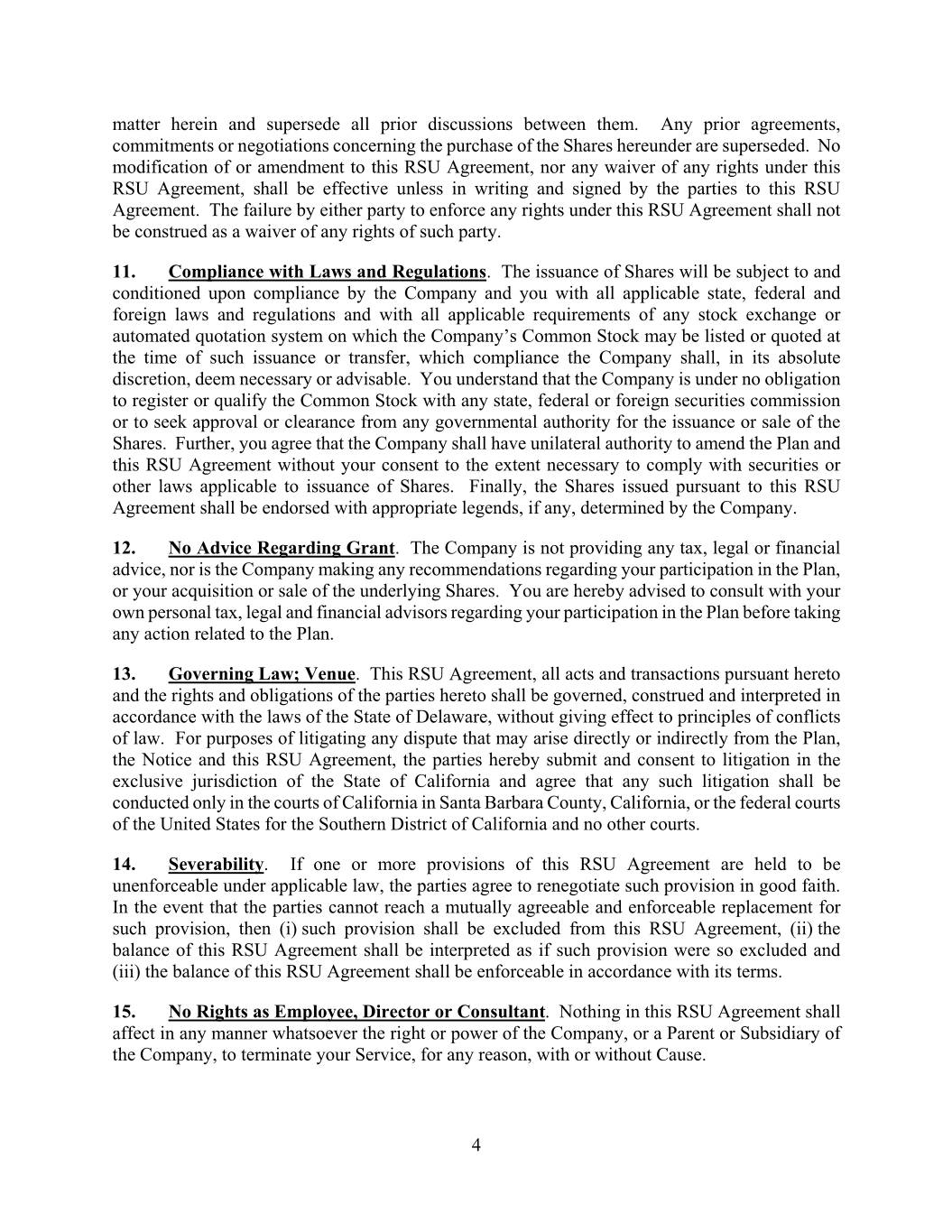 matter herein and supersede all prior discussions between them. Any prior agreements, commitments or negotiations concerning the purchase of the Shares hereunder are superseded. No modification of or amendment to this RSU Agreement, nor any waiver of any rights under this RSU Agreement, shall be effective unless in writing and signed by the parties to this RSU Agreement. The failure by either party to enforce any rights under this RSU Agreement shall not be construed as a waiver of any rights of such party. 11. Compliance with Laws and Regulations. The issuance of Shares will be subject to and conditioned upon compliance by the Company and you with all applicable state, federal and foreign laws and regulations and with all applicable requirements of any stock exchange or automated quotation system on which the Company’s Common Stock may be listed or quoted at the time of such issuance or transfer, which compliance the Company shall, in its absolute discretion, deem necessary or advisable. You understand that the Company is under no obligation to register or qualify the Common Stock with any state, federal or foreign securities commission or to seek approval or clearance from any governmental authority for the issuance or sale of the Shares. Further, you agree that the Company shall have unilateral authority to amend the Plan and this RSU Agreement without your consent to the extent necessary to comply with securities or other laws applicable to issuance of Shares. Finally, the Shares issued pursuant to this RSU Agreement shall be endorsed with appropriate legends, if any, determined by the Company. 12. No Advice Regarding Grant. The Company is not providing any tax, legal or financial advice, nor is the Company making any recommendations regarding your participation in the Plan, or your acquisition or sale of the underlying Shares. You are hereby advised to consult with your own personal tax, legal and financial advisors regarding your participation in the Plan before taking any action related to the Plan. 13. Governing Law; Venue. This RSU Agreement, all acts and transactions pursuant hereto and the rights and obligations of the parties hereto shall be governed, construed and interpreted in accordance with the laws of the State of Delaware, without giving effect to principles of conflicts of law. For purposes of litigating any dispute that may arise directly or indirectly from the Plan, the Notice and this RSU Agreement, the parties hereby submit and consent to litigation in the exclusive jurisdiction of the State of California and agree that any such litigation shall be conducted only in the courts of California in Santa Barbara County, California, or the federal courts of the United States for the Southern District of California and no other courts. 14. Severability. If one or more provisions of this RSU Agreement are held to be unenforceable under applicable law, the parties agree to renegotiate such provision in good faith. In the event that the parties cannot reach a mutually agreeable and enforceable replacement for such provision, then (i) such provision shall be excluded from this RSU Agreement, (ii) the balance of this RSU Agreement shall be interpreted as if such provision were so excluded and (iii) the balance of this RSU Agreement shall be enforceable in accordance with its terms. 15. No Rights as Employee, Director or Consultant. Nothing in this RSU Agreement shall affect in any manner whatsoever the right or power of the Company, or a Parent or Subsidiary of the Company, to terminate your Service, for any reason, with or without Cause. 4