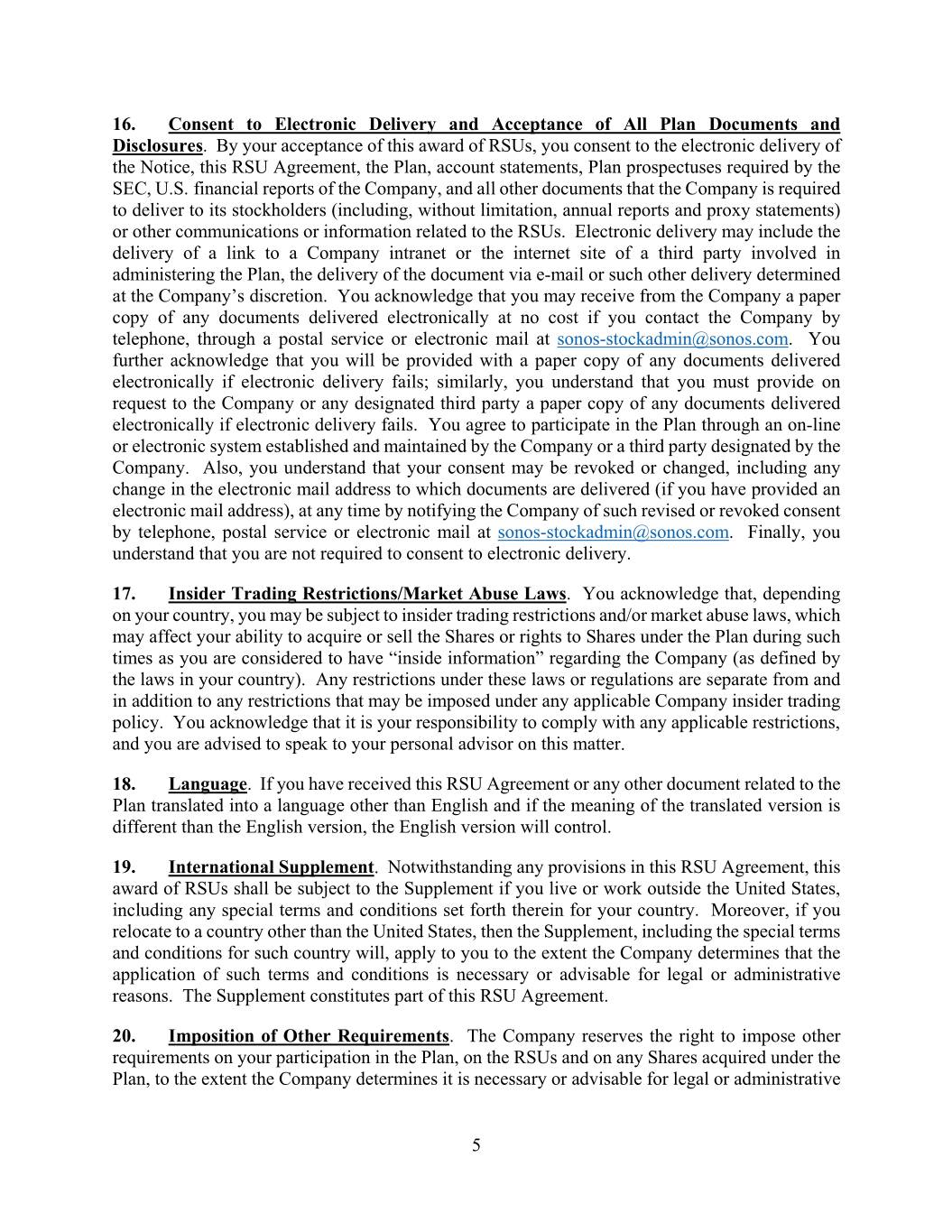 16. Consent to Electronic Delivery and Acceptance of All Plan Documents and Disclosures. By your acceptance of this award of RSUs, you consent to the electronic delivery of the Notice, this RSU Agreement, the Plan, account statements, Plan prospectuses required by the SEC, U.S. financial reports of the Company, and all other documents that the Company is required to deliver to its stockholders (including, without limitation, annual reports and proxy statements) or other communications or information related to the RSUs. Electronic delivery may include the delivery of a link to a Company intranet or the internet site of a third party involved in administering the Plan, the delivery of the document via e-mail or such other delivery determined at the Company’s discretion. You acknowledge that you may receive from the Company a paper copy of any documents delivered electronically at no cost if you contact the Company by telephone, through a postal service or electronic mail at sonos-stockadmin@sonos.com. You further acknowledge that you will be provided with a paper copy of any documents delivered electronically if electronic delivery fails; similarly, you understand that you must provide on request to the Company or any designated third party a paper copy of any documents delivered electronically if electronic delivery fails. You agree to participate in the Plan through an on-line or electronic system established and maintained by the Company or a third party designated by the Company. Also, you understand that your consent may be revoked or changed, including any change in the electronic mail address to which documents are delivered (if you have provided an electronic mail address), at any time by notifying the Company of such revised or revoked consent by telephone, postal service or electronic mail at sonos-stockadmin@sonos.com. Finally, you understand that you are not required to consent to electronic delivery. 17. Insider Trading Restrictions/Market Abuse Laws. You acknowledge that, depending on your country, you may be subject to insider trading restrictions and/or market abuse laws, which may affect your ability to acquire or sell the Shares or rights to Shares under the Plan during such times as you are considered to have “inside information” regarding the Company (as defined by the laws in your country). Any restrictions under these laws or regulations are separate from and in addition to any restrictions that may be imposed under any applicable Company insider trading policy. You acknowledge that it is your responsibility to comply with any applicable restrictions, and you are advised to speak to your personal advisor on this matter. 18. Language. If you have received this RSU Agreement or any other document related to the Plan translated into a language other than English and if the meaning of the translated version is different than the English version, the English version will control. 19. International Supplement. Notwithstanding any provisions in this RSU Agreement, this award of RSUs shall be subject to the Supplement if you live or work outside the United States, including any special terms and conditions set forth therein for your country. Moreover, if you relocate to a country other than the United States, then the Supplement, including the special terms and conditions for such country will, apply to you to the extent the Company determines that the application of such terms and conditions is necessary or advisable for legal or administrative reasons. The Supplement constitutes part of this RSU Agreement. 20. Imposition of Other Requirements. The Company reserves the right to impose other requirements on your participation in the Plan, on the RSUs and on any Shares acquired under the Plan, to the extent the Company determines it is necessary or advisable for legal or administrative 5