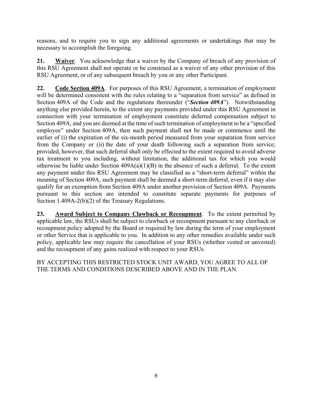 reasons, and to require you to sign any additional agreements or undertakings that may be necessary to accomplish the foregoing. 21. Waiver. You acknowledge that a waiver by the Company of breach of any provision of this RSU Agreement shall not operate or be construed as a waiver of any other provision of this RSU Agreement, or of any subsequent breach by you or any other Participant. 22. Code Section 409A. For purposes of this RSU Agreement, a termination of employment will be determined consistent with the rules relating to a “separation from service” as defined in Section 409A of the Code and the regulations thereunder (“Section 409A”). Notwithstanding anything else provided herein, to the extent any payments provided under this RSU Agreement in connection with your termination of employment constitute deferred compensation subject to Section 409A, and you are deemed at the time of such termination of employment to be a “specified employee” under Section 409A, then such payment shall not be made or commence until the earlier of (i) the expiration of the six-month period measured from your separation from service from the Company or (ii) the date of your death following such a separation from service; provided, however, that such deferral shall only be effected to the extent required to avoid adverse tax treatment to you including, without limitation, the additional tax for which you would otherwise be liable under Section 409A(a)(1)(B) in the absence of such a deferral. To the extent any payment under this RSU Agreement may be classified as a “short-term deferral” within the meaning of Section 409A, such payment shall be deemed a short-term deferral, even if it may also qualify for an exemption from Section 409A under another provision of Section 409A. Payments pursuant to this section are intended to constitute separate payments for purposes of Section 1.409A-2(b)(2) of the Treasury Regulations. 23. Award Subject to Company Clawback or Recoupment. To the extent permitted by applicable law, the RSUs shall be subject to clawback or recoupment pursuant to any clawback or recoupment policy adopted by the Board or required by law during the term of your employment or other Service that is applicable to you. In addition to any other remedies available under such policy, applicable law may require the cancellation of your RSUs (whether vested or unvested) and the recoupment of any gains realized with respect to your RSUs. BY ACCEPTING THIS RESTRICTED STOCK UNIT AWARD, YOU AGREE TO ALL OF THE TERMS AND CONDITIONS DESCRIBED ABOVE AND IN THE PLAN. 6