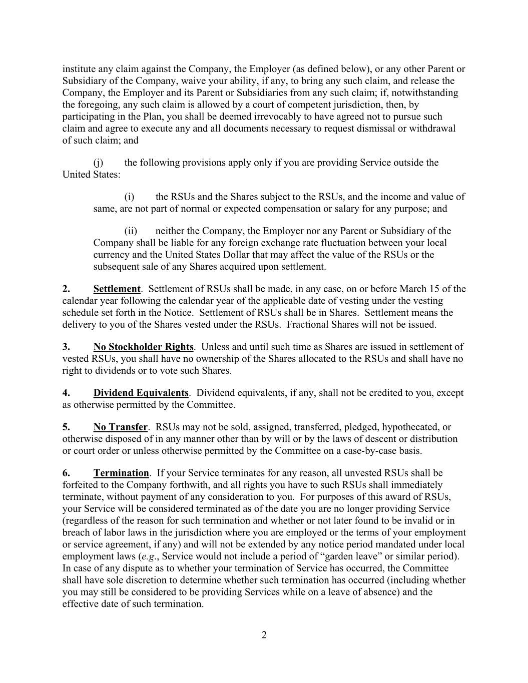 institute any claim against the Company, the Employer (as defined below), or any other Parent or Subsidiary of the Company, waive your ability, if any, to bring any such claim, and release the Company, the Employer and its Parent or Subsidiaries from any such claim; if, notwithstanding the foregoing, any such claim is allowed by a court of competent jurisdiction, then, by participating in the Plan, you shall be deemed irrevocably to have agreed not to pursue such claim and agree to execute any and all documents necessary to request dismissal or withdrawal of such claim; and (j) the following provisions apply only if you are providing Service outside the United States: (i) the RSUs and the Shares subject to the RSUs, and the income and value of same, are not part of normal or expected compensation or salary for any purpose; and (ii) neither the Company, the Employer nor any Parent or Subsidiary of the Company shall be liable for any foreign exchange rate fluctuation between your local currency and the United States Dollar that may affect the value of the RSUs or the subsequent sale of any Shares acquired upon settlement. 2. Settlement. Settlement of RSUs shall be made, in any case, on or before March 15 of the calendar year following the calendar year of the applicable date of vesting under the vesting schedule set forth in the Notice. Settlement of RSUs shall be in Shares. Settlement means the delivery to you of the Shares vested under the RSUs. Fractional Shares will not be issued. 3. No Stockholder Rights. Unless and until such time as Shares are issued in settlement of vested RSUs, you shall have no ownership of the Shares allocated to the RSUs and shall have no right to dividends or to vote such Shares. 4. Dividend Equivalents. Dividend equivalents, if any, shall not be credited to you, except as otherwise permitted by the Committee. 5. No Transfer. RSUs may not be sold, assigned, transferred, pledged, hypothecated, or otherwise disposed of in any manner other than by will or by the laws of descent or distribution or court order or unless otherwise permitted by the Committee on a case-by-case basis. 6. Termination. If your Service terminates for any reason, all unvested RSUs shall be forfeited to the Company forthwith, and all rights you have to such RSUs shall immediately terminate, without payment of any consideration to you. For purposes of this award of RSUs, your Service will be considered terminated as of the date you are no longer providing Service (regardless of the reason for such termination and whether or not later found to be invalid or in breach of labor laws in the jurisdiction where you are employed or the terms of your employment or service agreement, if any) and will not be extended by any notice period mandated under local employment laws (e.g., Service would not include a period of “garden leave” or similar period). In case of any dispute as to whether your termination of Service has occurred, the Committee shall have sole discretion to determine whether such termination has occurred (including whether you may still be considered to be providing Services while on a leave of absence) and the effective date of such termination. 2