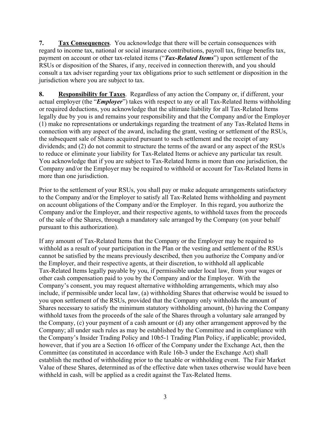 7. Tax Consequences. You acknowledge that there will be certain consequences with regard to income tax, national or social insurance contributions, payroll tax, fringe benefits tax, payment on account or other tax-related items (“Tax-Related Items”) upon settlement of the RSUs or disposition of the Shares, if any, received in connection therewith, and you should consult a tax adviser regarding your tax obligations prior to such settlement or disposition in the jurisdiction where you are subject to tax. 8. Responsibility for Taxes. Regardless of any action the Company or, if different, your actual employer (the “Employer”) takes with respect to any or all Tax-Related Items withholding or required deductions, you acknowledge that the ultimate liability for all Tax-Related Items legally due by you is and remains your responsibility and that the Company and/or the Employer (1) make no representations or undertakings regarding the treatment of any Tax-Related Items in connection with any aspect of the award, including the grant, vesting or settlement of the RSUs, the subsequent sale of Shares acquired pursuant to such settlement and the receipt of any dividends; and (2) do not commit to structure the terms of the award or any aspect of the RSUs to reduce or eliminate your liability for Tax-Related Items or achieve any particular tax result. You acknowledge that if you are subject to Tax-Related Items in more than one jurisdiction, the Company and/or the Employer may be required to withhold or account for Tax-Related Items in more than one jurisdiction. Prior to the settlement of your RSUs, you shall pay or make adequate arrangements satisfactory to the Company and/or the Employer to satisfy all Tax-Related Items withholding and payment on account obligations of the Company and/or the Employer. In this regard, you authorize the Company and/or the Employer, and their respective agents, to withhold taxes from the proceeds of the sale of the Shares, through a mandatory sale arranged by the Company (on your behalf pursuant to this authorization). If any amount of Tax-Related Items that the Company or the Employer may be required to withhold as a result of your participation in the Plan or the vesting and settlement of the RSUs cannot be satisfied by the means previously described, then you authorize the Company and/or the Employer, and their respective agents, at their discretion, to withhold all applicable Tax-Related Items legally payable by you, if permissible under local law, from your wages or other cash compensation paid to you by the Company and/or the Employer. With the Company’s consent, you may request alternative withholding arrangements, which may also include, if permissible under local law, (a) withholding Shares that otherwise would be issued to you upon settlement of the RSUs, provided that the Company only withholds the amount of Shares necessary to satisfy the minimum statutory withholding amount, (b) having the Company withhold taxes from the proceeds of the sale of the Shares through a voluntary sale arranged by the Company, (c) your payment of a cash amount or (d) any other arrangement approved by the Company; all under such rules as may be established by the Committee and in compliance with the Company’s Insider Trading Policy and 10b5-1 Trading Plan Policy, if applicable; provided, however, that if you are a Section 16 officer of the Company under the Exchange Act, then the Committee (as constituted in accordance with Rule 16b-3 under the Exchange Act) shall establish the method of withholding prior to the taxable or withholding event. The Fair Market Value of these Shares, determined as of the effective date when taxes otherwise would have been withheld in cash, will be applied as a credit against the Tax-Related Items. 3