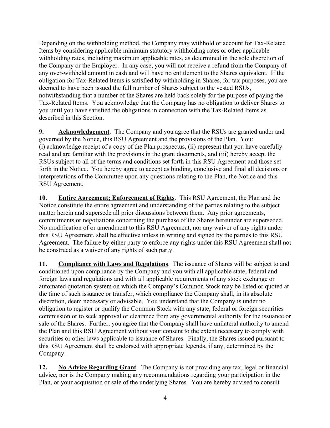 Depending on the withholding method, the Company may withhold or account for Tax-Related Items by considering applicable minimum statutory withholding rates or other applicable withholding rates, including maximum applicable rates, as determined in the sole discretion of the Company or the Employer. In any case, you will not receive a refund from the Company of any over-withheld amount in cash and will have no entitlement to the Shares equivalent. If the obligation for Tax-Related Items is satisfied by withholding in Shares, for tax purposes, you are deemed to have been issued the full number of Shares subject to the vested RSUs, notwithstanding that a number of the Shares are held back solely for the purpose of paying the Tax-Related Items. You acknowledge that the Company has no obligation to deliver Shares to you until you have satisfied the obligations in connection with the Tax-Related Items as described in this Section. 9. Acknowledgement. The Company and you agree that the RSUs are granted under and governed by the Notice, this RSU Agreement and the provisions of the Plan. You: (i) acknowledge receipt of a copy of the Plan prospectus, (ii) represent that you have carefully read and are familiar with the provisions in the grant documents, and (iii) hereby accept the RSUs subject to all of the terms and conditions set forth in this RSU Agreement and those set forth in the Notice. You hereby agree to accept as binding, conclusive and final all decisions or interpretations of the Committee upon any questions relating to the Plan, the Notice and this RSU Agreement. 10. Entire Agreement; Enforcement of Rights. This RSU Agreement, the Plan and the Notice constitute the entire agreement and understanding of the parties relating to the subject matter herein and supersede all prior discussions between them. Any prior agreements, commitments or negotiations concerning the purchase of the Shares hereunder are superseded. No modification of or amendment to this RSU Agreement, nor any waiver of any rights under this RSU Agreement, shall be effective unless in writing and signed by the parties to this RSU Agreement. The failure by either party to enforce any rights under this RSU Agreement shall not be construed as a waiver of any rights of such party. 11. Compliance with Laws and Regulations. The issuance of Shares will be subject to and conditioned upon compliance by the Company and you with all applicable state, federal and foreign laws and regulations and with all applicable requirements of any stock exchange or automated quotation system on which the Company’s Common Stock may be listed or quoted at the time of such issuance or transfer, which compliance the Company shall, in its absolute discretion, deem necessary or advisable. You understand that the Company is under no obligation to register or qualify the Common Stock with any state, federal or foreign securities commission or to seek approval or clearance from any governmental authority for the issuance or sale of the Shares. Further, you agree that the Company shall have unilateral authority to amend the Plan and this RSU Agreement without your consent to the extent necessary to comply with securities or other laws applicable to issuance of Shares. Finally, the Shares issued pursuant to this RSU Agreement shall be endorsed with appropriate legends, if any, determined by the Company. 12. No Advice Regarding Grant. The Company is not providing any tax, legal or financial advice, nor is the Company making any recommendations regarding your participation in the Plan, or your acquisition or sale of the underlying Shares. You are hereby advised to consult 4