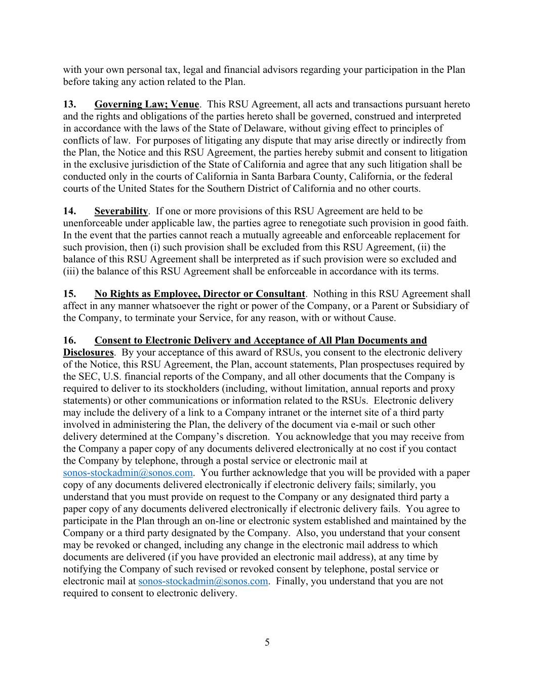 with your own personal tax, legal and financial advisors regarding your participation in the Plan before taking any action related to the Plan. 13. Governing Law; Venue. This RSU Agreement, all acts and transactions pursuant hereto and the rights and obligations of the parties hereto shall be governed, construed and interpreted in accordance with the laws of the State of Delaware, without giving effect to principles of conflicts of law. For purposes of litigating any dispute that may arise directly or indirectly from the Plan, the Notice and this RSU Agreement, the parties hereby submit and consent to litigation in the exclusive jurisdiction of the State of California and agree that any such litigation shall be conducted only in the courts of California in Santa Barbara County, California, or the federal courts of the United States for the Southern District of California and no other courts. 14. Severability. If one or more provisions of this RSU Agreement are held to be unenforceable under applicable law, the parties agree to renegotiate such provision in good faith. In the event that the parties cannot reach a mutually agreeable and enforceable replacement for such provision, then (i) such provision shall be excluded from this RSU Agreement, (ii) the balance of this RSU Agreement shall be interpreted as if such provision were so excluded and (iii) the balance of this RSU Agreement shall be enforceable in accordance with its terms. 15. No Rights as Employee, Director or Consultant. Nothing in this RSU Agreement shall affect in any manner whatsoever the right or power of the Company, or a Parent or Subsidiary of the Company, to terminate your Service, for any reason, with or without Cause. 16. Consent to Electronic Delivery and Acceptance of All Plan Documents and Disclosures. By your acceptance of this award of RSUs, you consent to the electronic delivery of the Notice, this RSU Agreement, the Plan, account statements, Plan prospectuses required by the SEC, U.S. financial reports of the Company, and all other documents that the Company is required to deliver to its stockholders (including, without limitation, annual reports and proxy statements) or other communications or information related to the RSUs. Electronic delivery may include the delivery of a link to a Company intranet or the internet site of a third party involved in administering the Plan, the delivery of the document via e-mail or such other delivery determined at the Company’s discretion. You acknowledge that you may receive from the Company a paper copy of any documents delivered electronically at no cost if you contact the Company by telephone, through a postal service or electronic mail at sonos-stockadmin@sonos.com. You further acknowledge that you will be provided with a paper copy of any documents delivered electronically if electronic delivery fails; similarly, you understand that you must provide on request to the Company or any designated third party a paper copy of any documents delivered electronically if electronic delivery fails. You agree to participate in the Plan through an on-line or electronic system established and maintained by the Company or a third party designated by the Company. Also, you understand that your consent may be revoked or changed, including any change in the electronic mail address to which documents are delivered (if you have provided an electronic mail address), at any time by notifying the Company of such revised or revoked consent by telephone, postal service or electronic mail at sonos-stockadmin@sonos.com. Finally, you understand that you are not required to consent to electronic delivery. 5