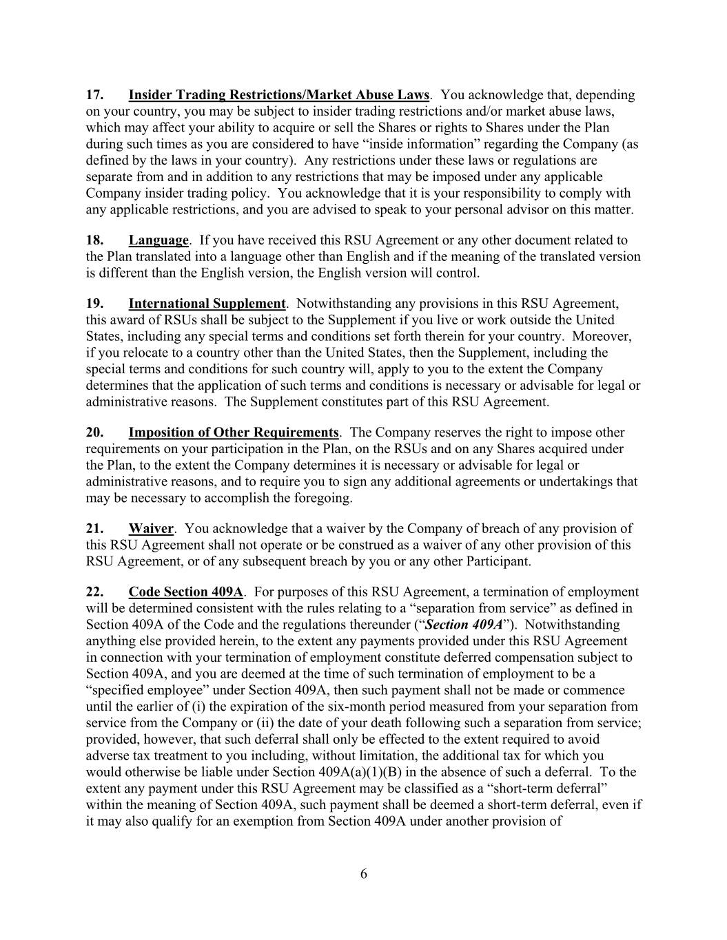 17. Insider Trading Restrictions/Market Abuse Laws. You acknowledge that, depending on your country, you may be subject to insider trading restrictions and/or market abuse laws, which may affect your ability to acquire or sell the Shares or rights to Shares under the Plan during such times as you are considered to have “inside information” regarding the Company (as defined by the laws in your country). Any restrictions under these laws or regulations are separate from and in addition to any restrictions that may be imposed under any applicable Company insider trading policy. You acknowledge that it is your responsibility to comply with any applicable restrictions, and you are advised to speak to your personal advisor on this matter. 18. Language. If you have received this RSU Agreement or any other document related to the Plan translated into a language other than English and if the meaning of the translated version is different than the English version, the English version will control. 19. International Supplement. Notwithstanding any provisions in this RSU Agreement, this award of RSUs shall be subject to the Supplement if you live or work outside the United States, including any special terms and conditions set forth therein for your country. Moreover, if you relocate to a country other than the United States, then the Supplement, including the special terms and conditions for such country will, apply to you to the extent the Company determines that the application of such terms and conditions is necessary or advisable for legal or administrative reasons. The Supplement constitutes part of this RSU Agreement. 20. Imposition of Other Requirements. The Company reserves the right to impose other requirements on your participation in the Plan, on the RSUs and on any Shares acquired under the Plan, to the extent the Company determines it is necessary or advisable for legal or administrative reasons, and to require you to sign any additional agreements or undertakings that may be necessary to accomplish the foregoing. 21. Waiver. You acknowledge that a waiver by the Company of breach of any provision of this RSU Agreement shall not operate or be construed as a waiver of any other provision of this RSU Agreement, or of any subsequent breach by you or any other Participant. 22. Code Section 409A. For purposes of this RSU Agreement, a termination of employment will be determined consistent with the rules relating to a “separation from service” as defined in Section 409A of the Code and the regulations thereunder (“Section 409A”). Notwithstanding anything else provided herein, to the extent any payments provided under this RSU Agreement in connection with your termination of employment constitute deferred compensation subject to Section 409A, and you are deemed at the time of such termination of employment to be a “specified employee” under Section 409A, then such payment shall not be made or commence until the earlier of (i) the expiration of the six-month period measured from your separation from service from the Company or (ii) the date of your death following such a separation from service; provided, however, that such deferral shall only be effected to the extent required to avoid adverse tax treatment to you including, without limitation, the additional tax for which you would otherwise be liable under Section 409A(a)(1)(B) in the absence of such a deferral. To the extent any payment under this RSU Agreement may be classified as a “short-term deferral” within the meaning of Section 409A, such payment shall be deemed a short-term deferral, even if it may also qualify for an exemption from Section 409A under another provision of 6