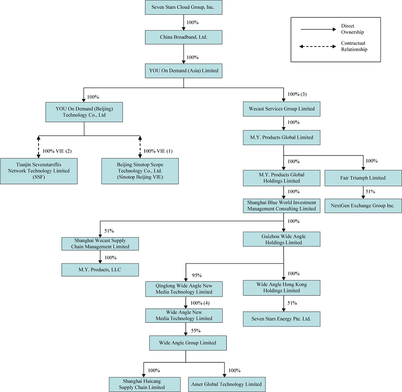 Seven Stars Cloud Group, Inc. (NASDAQ: SSC) was incorporated in the State of Nevada on October 19, 2004. Since 2010, it has been a premium content Video On Demand (“VOD”) services provider with primary operations in the People’s Republic of China through its subsidiaries and variable interest entities. It provided premium content and integrated value-added service solutions for the delivery of VOD and paid video programming to digital cable providers, Internet Protocol Television (“IPTV”) providers, Over-the-Top (“OTT”) streaming providers, mobile manufacturers and operators, as well as direct customers.