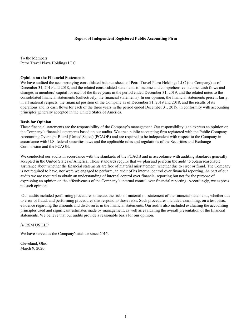 Report of Independent Registered Public Accounting Firm To the Members Petro Travel Plaza Holdings LLC Opinion on the Financial Statements We have audited the accompanying consolidated balance sheets of Petro Travel Plaza Holdings LLC (the Company) as of December 31, 2019 and 2018, and the related consolidated statements of income and comprehensive income, cash flows and changes in members’ capital for each of the three years in the period ended December 31, 2019, and the related notes to the consolidated financial statements (collectively, the financial statements). In our opinion, the financial statements present fairly, in all material respects, the financial position of the Company as of December 31, 2019 and 2018, and the results of its operations and its cash flows for each of the three years in the period ended December 31, 2019, in conformity with accounting principles generally accepted in the United States of America. Basis for Opinion These financial statements are the responsibility of the Company’s management. Our responsibility is to express an opinion on the Company’s financial statements based on our audits. We are a public accounting firm registered with the Public Company Accounting Oversight Board (United States) (PCAOB) and are required to be independent with respect to the Company in accordance with U.S. federal securities laws and the applicable rules and regulations of the Securities and Exchange Commission and the PCAOB. We conducted our audits in accordance with the standards of the PCAOB and in accordance with auditing standards generally accepted in the United States of America. Those standards require that we plan and perform the audit to obtain reasonable assurance about whether the financial statements are free of material misstatement, whether due to error or fraud. The Company is not required to have, nor were we engaged to perform, an audit of its internal control over financial reporting. As part of our audits we are required to obtain an understanding of internal control over financial reporting but not for the purpose of expressing an opinion on the effectiveness of the Company’s internal control over financial reporting. Accordingly, we express no such opinion. Our audits included performing procedures to assess the risks of material misstatement of the financial statements, whether due to error or fraud, and performing procedures that respond to those risks. Such procedures included examining, on a test basis, evidence regarding the amounts and disclosures in the financial statements. Our audits also included evaluating the accounting principles used and significant estimates made by management, as well as evaluating the overall presentation of the financial statements. We believe that our audits provide a reasonable basis for our opinion. /s/ RSM US LLP We have served as the Company's auditor since 2015. Cleveland, Ohio March 9, 2020 1