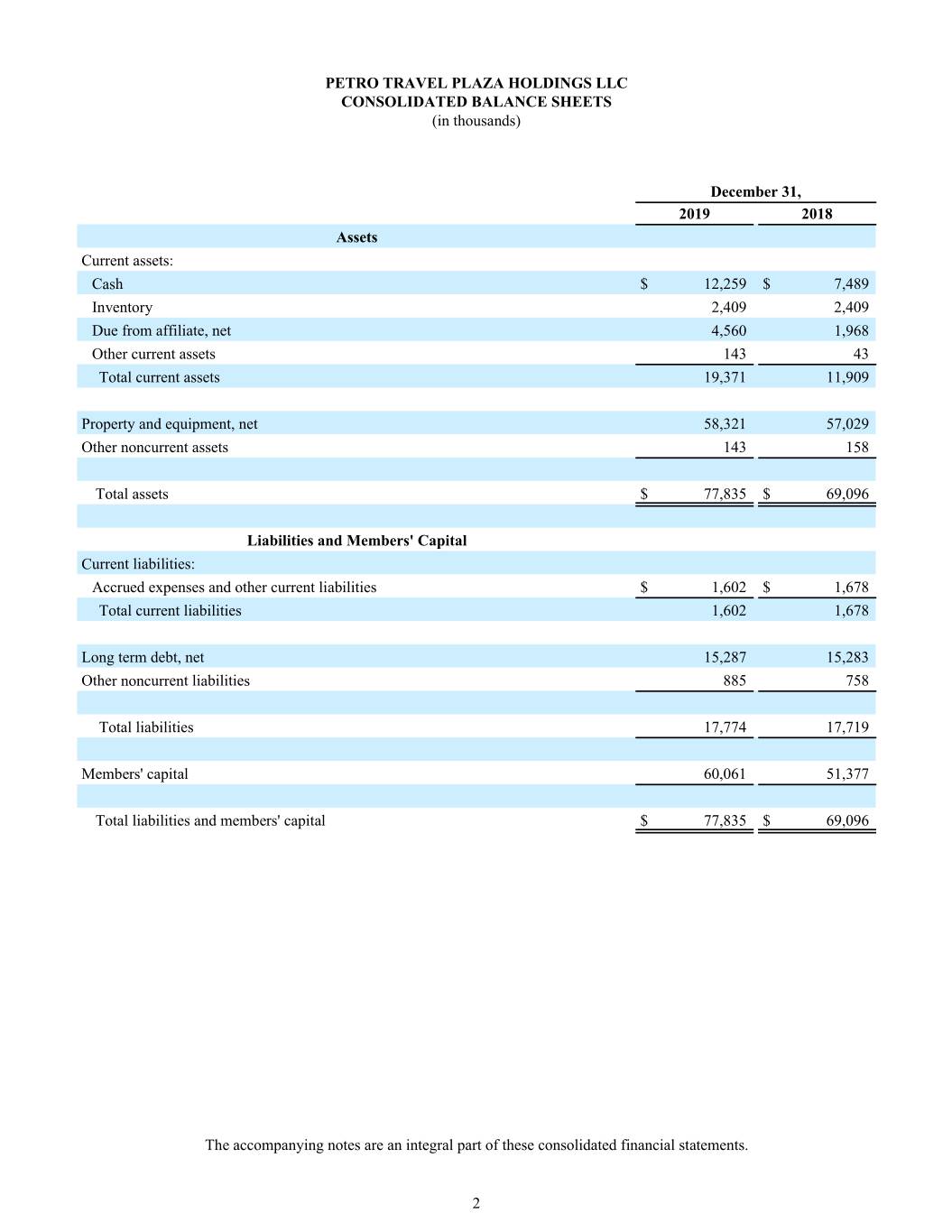 PETRO TRAVEL PLAZA HOLDINGS LLC CONSOLIDATED BALANCE SHEETS (in thousands) December 31, 2019 2018 Assets Current assets: Cash $ 12,259 $ 7,489 Inventory 2,409 2,409 Due from affiliate, net 4,560 1,968 Other current assets 143 43 Total current assets 19,371 11,909 Property and equipment, net 58,321 57,029 Other noncurrent assets 143 158 Total assets $ 77,835 $ 69,096 Liabilities and Members' Capital Current liabilities: Accrued expenses and other current liabilities $ 1,602 $ 1,678 Total current liabilities 1,602 1,678 Long term debt, net 15,287 15,283 Other noncurrent liabilities 885 758 Total liabilities 17,774 17,719 Members' capital 60,061 51,377 Total liabilities and members' capital $ 77,835 $ 69,096 The accompanying notes are an integral part of these consolidated financial statements. 2