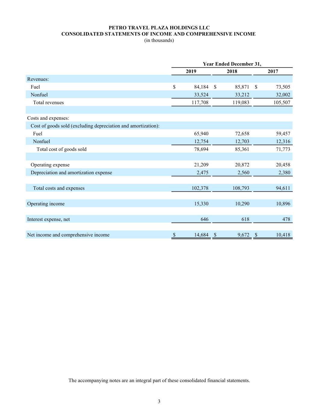 PETRO TRAVEL PLAZA HOLDINGS LLC CONSOLIDATED STATEMENTS OF INCOME AND COMPREHENSIVE INCOME (in thousands) Year Ended December 31, 2019 2018 2017 Revenues: Fuel $ 84,184 $ 85,871 $ 73,505 Nonfuel 33,524 33,212 32,002 Total revenues 117,708 119,083 105,507 Costs and expenses: Cost of goods sold (excluding depreciation and amortization): Fuel 65,940 72,658 59,457 Nonfuel 12,754 12,703 12,316 Total cost of goods sold 78,694 85,361 71,773 Operating expense 21,209 20,872 20,458 Depreciation and amortization expense 2,475 2,560 2,380 Total costs and expenses 102,378 108,793 94,611 Operating income 15,330 10,290 10,896 Interest expense, net 646 618 478 Net income and comprehensive income $ 14,684 $ 9,672 $ 10,418 The accompanying notes are an integral part of these consolidated financial statements. 3