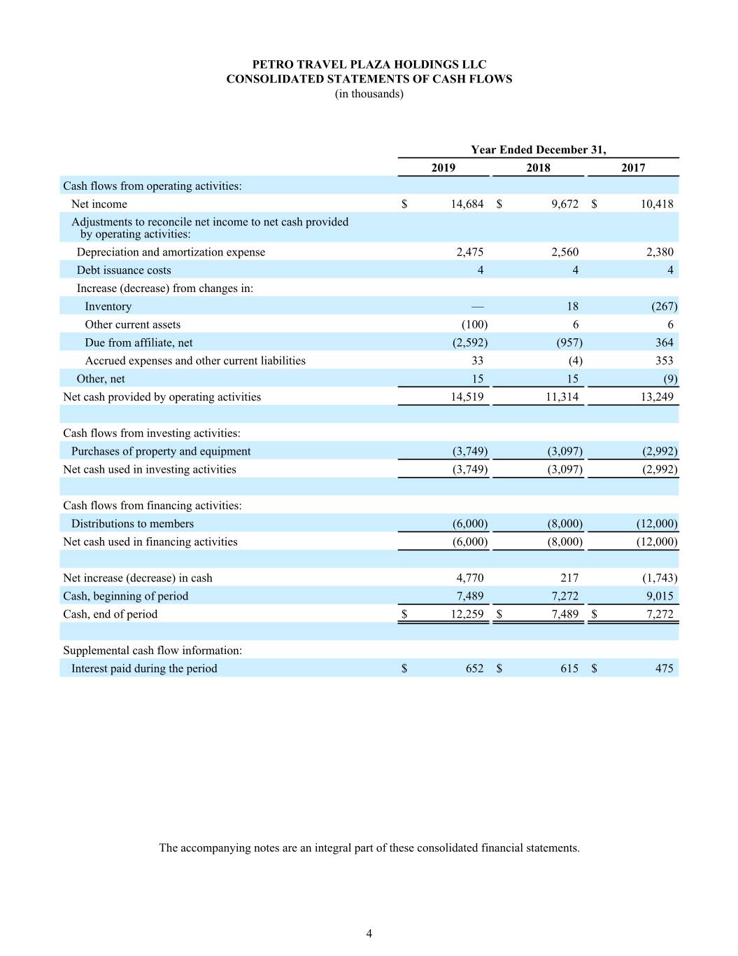 PETRO TRAVEL PLAZA HOLDINGS LLC CONSOLIDATED STATEMENTS OF CASH FLOWS (in thousands) Year Ended December 31, 2019 2018 2017 Cash flows from operating activities: Net income $ 14,684 $ 9,672 $ 10,418 Adjustments to reconcile net income to net cash provided by operating activities: Depreciation and amortization expense 2,475 2,560 2,380 Debt issuance costs 4 4 4 Increase (decrease) from changes in: Inventory — 18 (267) Other current assets (100) 6 6 Due from affiliate, net (2,592) (957) 364 Accrued expenses and other current liabilities 33 (4) 353 Other, net 15 15 (9) Net cash provided by operating activities 14,519 11,314 13,249 Cash flows from investing activities: Purchases of property and equipment (3,749) (3,097) (2,992) Net cash used in investing activities (3,749) (3,097) (2,992) Cash flows from financing activities: Distributions to members (6,000) (8,000) (12,000) Net cash used in financing activities (6,000) (8,000) (12,000) Net increase (decrease) in cash 4,770 217 (1,743) Cash, beginning of period 7,489 7,272 9,015 Cash, end of period $ 12,259 $ 7,489 $ 7,272 Supplemental cash flow information: Interest paid during the period $ 652 $ 615 $ 475 The accompanying notes are an integral part of these consolidated financial statements. 4
