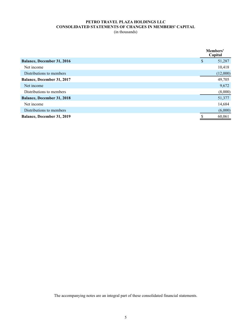 PETRO TRAVEL PLAZA HOLDINGS LLC CONSOLIDATED STATEMENTS OF CHANGES IN MEMBERS' CAPITAL (in thousands) Members' Capital Balance, December 31, 2016 $ 51,287 Net income 10,418 Distributions to members (12,000) Balance, December 31, 2017 49,705 Net income 9,672 Distributions to members (8,000) Balance, December 31, 2018 51,377 Net income 14,684 Distributions to members (6,000) Balance, December 31, 2019 $ 60,061 The accompanying notes are an integral part of these consolidated financial statements. 5