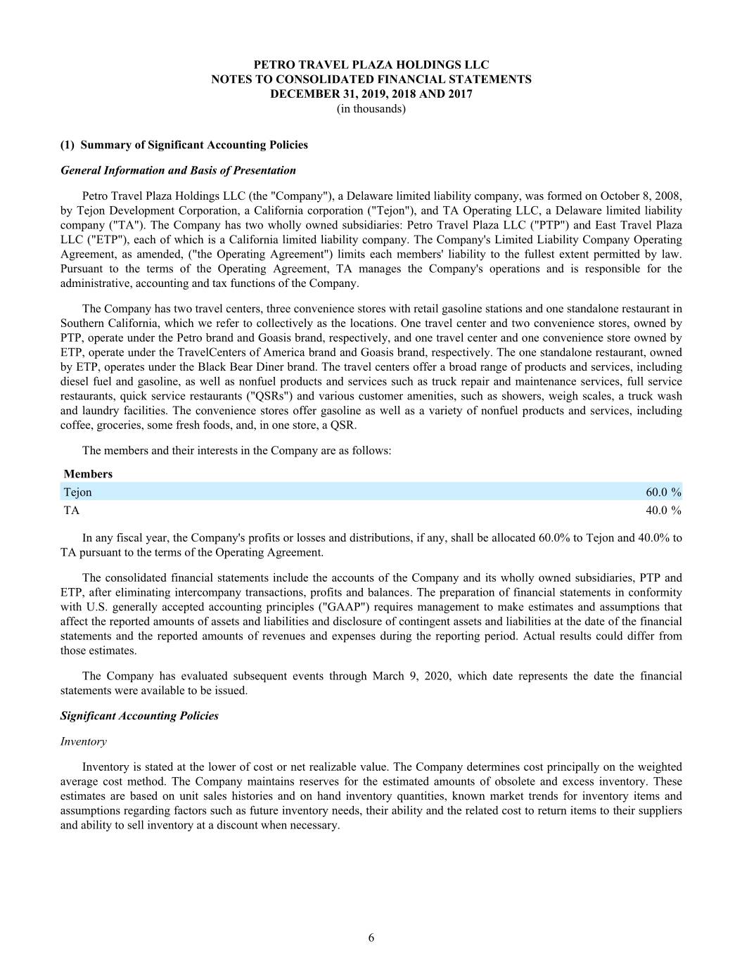 PETRO TRAVEL PLAZA HOLDINGS LLC NOTES TO CONSOLIDATED FINANCIAL STATEMENTS DECEMBER 31, 2019, 2018 AND 2017 (in thousands) (1) Summary of Significant Accounting Policies General Information and Basis of Presentation Petro Travel Plaza Holdings LLC (the "Company"), a Delaware limited liability company, was formed on October 8, 2008, by Tejon Development Corporation, a California corporation ("Tejon"), and TA Operating LLC, a Delaware limited liability company ("TA"). The Company has two wholly owned subsidiaries: Petro Travel Plaza LLC ("PTP") and East Travel Plaza LLC ("ETP"), each of which is a California limited liability company. The Company's Limited Liability Company Operating Agreement, as amended, ("the Operating Agreement") limits each members' liability to the fullest extent permitted by law. Pursuant to the terms of the Operating Agreement, TA manages the Company's operations and is responsible for the administrative, accounting and tax functions of the Company. The Company has two travel centers, three convenience stores with retail gasoline stations and one standalone restaurant in Southern California, which we refer to collectively as the locations. One travel center and two convenience stores, owned by PTP, operate under the Petro brand and Goasis brand, respectively, and one travel center and one convenience store owned by ETP, operate under the TravelCenters of America brand and Goasis brand, respectively. The one standalone restaurant, owned by ETP, operates under the Black Bear Diner brand. The travel centers offer a broad range of products and services, including diesel fuel and gasoline, as well as nonfuel products and services such as truck repair and maintenance services, full service restaurants, quick service restaurants ("QSRs") and various customer amenities, such as showers, weigh scales, a truck wash and laundry facilities. The convenience stores offer gasoline as well as a variety of nonfuel products and services, including coffee, groceries, some fresh foods, and, in one store, a QSR. The members and their interests in the Company are as follows: Members Tejon 60.0 % TA 40.0 % In any fiscal year, the Company's profits or losses and distributions, if any, shall be allocated 60.0% to Tejon and 40.0% to TA pursuant to the terms of the Operating Agreement. The consolidated financial statements include the accounts of the Company and its wholly owned subsidiaries, PTP and ETP, after eliminating intercompany transactions, profits and balances. The preparation of financial statements in conformity with U.S. generally accepted accounting principles ("GAAP") requires management to make estimates and assumptions that affect the reported amounts of assets and liabilities and disclosure of contingent assets and liabilities at the date of the financial statements and the reported amounts of revenues and expenses during the reporting period. Actual results could differ from those estimates. The Company has evaluated subsequent events through March 9, 2020, which date represents the date the financial statements were available to be issued. Significant Accounting Policies Inventory Inventory is stated at the lower of cost or net realizable value. The Company determines cost principally on the weighted average cost method. The Company maintains reserves for the estimated amounts of obsolete and excess inventory. These estimates are based on unit sales histories and on hand inventory quantities, known market trends for inventory items and assumptions regarding factors such as future inventory needs, their ability and the related cost to return items to their suppliers and ability to sell inventory at a discount when necessary. 6