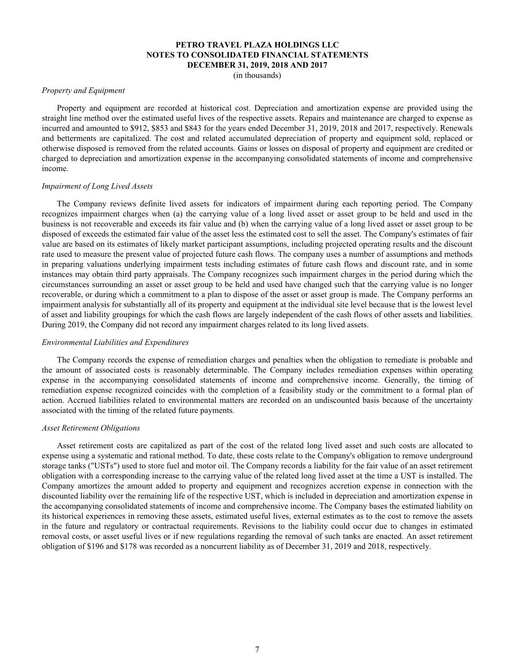 PETRO TRAVEL PLAZA HOLDINGS LLC NOTES TO CONSOLIDATED FINANCIAL STATEMENTS DECEMBER 31, 2019, 2018 AND 2017 (in thousands) Property and Equipment Property and equipment are recorded at historical cost. Depreciation and amortization expense are provided using the straight line method over the estimated useful lives of the respective assets. Repairs and maintenance are charged to expense as incurred and amounted to $912, $853 and $843 for the years ended December 31, 2019, 2018 and 2017, respectively. Renewals and betterments are capitalized. The cost and related accumulated depreciation of property and equipment sold, replaced or otherwise disposed is removed from the related accounts. Gains or losses on disposal of property and equipment are credited or charged to depreciation and amortization expense in the accompanying consolidated statements of income and comprehensive income. Impairment of Long Lived Assets The Company reviews definite lived assets for indicators of impairment during each reporting period. The Company recognizes impairment charges when (a) the carrying value of a long lived asset or asset group to be held and used in the business is not recoverable and exceeds its fair value and (b) when the carrying value of a long lived asset or asset group to be disposed of exceeds the estimated fair value of the asset less the estimated cost to sell the asset. The Company's estimates of fair value are based on its estimates of likely market participant assumptions, including projected operating results and the discount rate used to measure the present value of projected future cash flows. The company uses a number of assumptions and methods in preparing valuations underlying impairment tests including estimates of future cash flows and discount rate, and in some instances may obtain third party appraisals. The Company recognizes such impairment charges in the period during which the circumstances surrounding an asset or asset group to be held and used have changed such that the carrying value is no longer recoverable, or during which a commitment to a plan to dispose of the asset or asset group is made. The Company performs an impairment analysis for substantially all of its property and equipment at the individual site level because that is the lowest level of asset and liability groupings for which the cash flows are largely independent of the cash flows of other assets and liabilities. During 2019, the Company did not record any impairment charges related to its long lived assets. Environmental Liabilities and Expenditures The Company records the expense of remediation charges and penalties when the obligation to remediate is probable and the amount of associated costs is reasonably determinable. The Company includes remediation expenses within operating expense in the accompanying consolidated statements of income and comprehensive income. Generally, the timing of remediation expense recognized coincides with the completion of a feasibility study or the commitment to a formal plan of action. Accrued liabilities related to environmental matters are recorded on an undiscounted basis because of the uncertainty associated with the timing of the related future payments. Asset Retirement Obligations Asset retirement costs are capitalized as part of the cost of the related long lived asset and such costs are allocated to expense using a systematic and rational method. To date, these costs relate to the Company's obligation to remove underground storage tanks ("USTs") used to store fuel and motor oil. The Company records a liability for the fair value of an asset retirement obligation with a corresponding increase to the carrying value of the related long lived asset at the time a UST is installed. The Company amortizes the amount added to property and equipment and recognizes accretion expense in connection with the discounted liability over the remaining life of the respective UST, which is included in depreciation and amortization expense in the accompanying consolidated statements of income and comprehensive income. The Company bases the estimated liability on its historical experiences in removing these assets, estimated useful lives, external estimates as to the cost to remove the assets in the future and regulatory or contractual requirements. Revisions to the liability could occur due to changes in estimated removal costs, or asset useful lives or if new regulations regarding the removal of such tanks are enacted. An asset retirement obligation of $196 and $178 was recorded as a noncurrent liability as of December 31, 2019 and 2018, respectively. 7