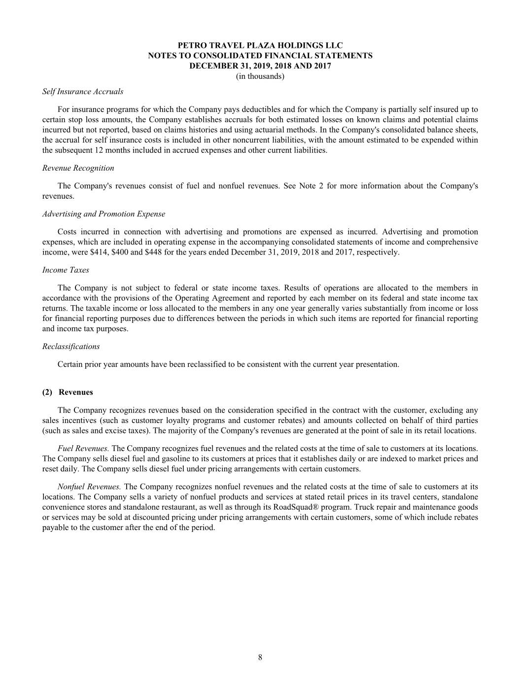 PETRO TRAVEL PLAZA HOLDINGS LLC NOTES TO CONSOLIDATED FINANCIAL STATEMENTS DECEMBER 31, 2019, 2018 AND 2017 (in thousands) Self Insurance Accruals For insurance programs for which the Company pays deductibles and for which the Company is partially self insured up to certain stop loss amounts, the Company establishes accruals for both estimated losses on known claims and potential claims incurred but not reported, based on claims histories and using actuarial methods. In the Company's consolidated balance sheets, the accrual for self insurance costs is included in other noncurrent liabilities, with the amount estimated to be expended within the subsequent 12 months included in accrued expenses and other current liabilities. Revenue Recognition The Company's revenues consist of fuel and nonfuel revenues. See Note 2 for more information about the Company's revenues. Advertising and Promotion Expense Costs incurred in connection with advertising and promotions are expensed as incurred. Advertising and promotion expenses, which are included in operating expense in the accompanying consolidated statements of income and comprehensive income, were $414, $400 and $448 for the years ended December 31, 2019, 2018 and 2017, respectively. Income Taxes The Company is not subject to federal or state income taxes. Results of operations are allocated to the members in accordance with the provisions of the Operating Agreement and reported by each member on its federal and state income tax returns. The taxable income or loss allocated to the members in any one year generally varies substantially from income or loss for financial reporting purposes due to differences between the periods in which such items are reported for financial reporting and income tax purposes. Reclassifications Certain prior year amounts have been reclassified to be consistent with the current year presentation. (2) Revenues The Company recognizes revenues based on the consideration specified in the contract with the customer, excluding any sales incentives (such as customer loyalty programs and customer rebates) and amounts collected on behalf of third parties (such as sales and excise taxes). The majority of the Company's revenues are generated at the point of sale in its retail locations. Fuel Revenues. The Company recognizes fuel revenues and the related costs at the time of sale to customers at its locations. The Company sells diesel fuel and gasoline to its customers at prices that it establishes daily or are indexed to market prices and reset daily. The Company sells diesel fuel under pricing arrangements with certain customers. Nonfuel Revenues. The Company recognizes nonfuel revenues and the related costs at the time of sale to customers at its locations. The Company sells a variety of nonfuel products and services at stated retail prices in its travel centers, standalone convenience stores and standalone restaurant, as well as through its RoadSquad® program. Truck repair and maintenance goods or services may be sold at discounted pricing under pricing arrangements with certain customers, some of which include rebates payable to the customer after the end of the period. 8