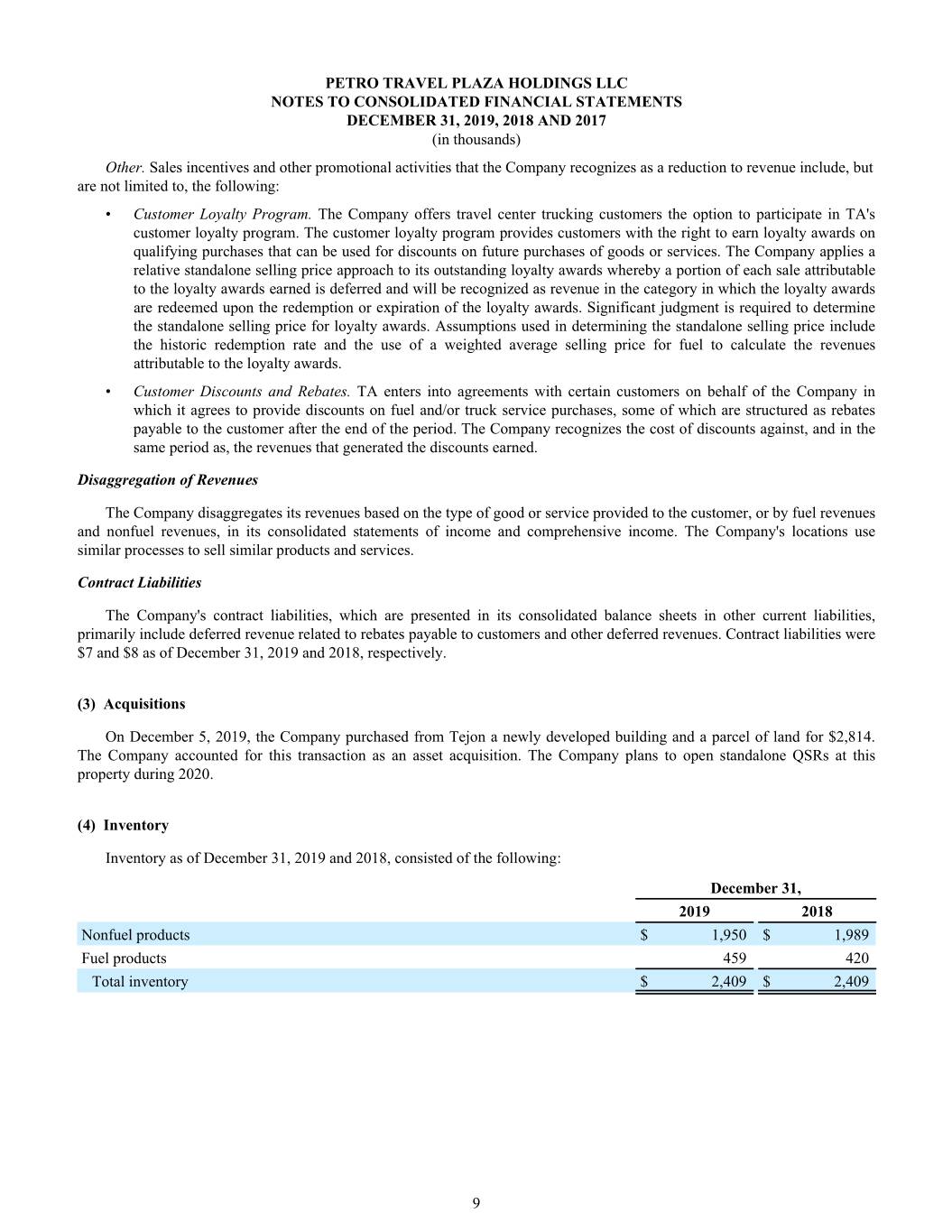 PETRO TRAVEL PLAZA HOLDINGS LLC NOTES TO CONSOLIDATED FINANCIAL STATEMENTS DECEMBER 31, 2019, 2018 AND 2017 (in thousands) Other. Sales incentives and other promotional activities that the Company recognizes as a reduction to revenue include, but are not limited to, the following: • Customer Loyalty Program. The Company offers travel center trucking customers the option to participate in TA's customer loyalty program. The customer loyalty program provides customers with the right to earn loyalty awards on qualifying purchases that can be used for discounts on future purchases of goods or services. The Company applies a relative standalone selling price approach to its outstanding loyalty awards whereby a portion of each sale attributable to the loyalty awards earned is deferred and will be recognized as revenue in the category in which the loyalty awards are redeemed upon the redemption or expiration of the loyalty awards. Significant judgment is required to determine the standalone selling price for loyalty awards. Assumptions used in determining the standalone selling price include the historic redemption rate and the use of a weighted average selling price for fuel to calculate the revenues attributable to the loyalty awards. • Customer Discounts and Rebates. TA enters into agreements with certain customers on behalf of the Company in which it agrees to provide discounts on fuel and/or truck service purchases, some of which are structured as rebates payable to the customer after the end of the period. The Company recognizes the cost of discounts against, and in the same period as, the revenues that generated the discounts earned. Disaggregation of Revenues The Company disaggregates its revenues based on the type of good or service provided to the customer, or by fuel revenues and nonfuel revenues, in its consolidated statements of income and comprehensive income. The Company's locations use similar processes to sell similar products and services. Contract Liabilities The Company's contract liabilities, which are presented in its consolidated balance sheets in other current liabilities, primarily include deferred revenue related to rebates payable to customers and other deferred revenues. Contract liabilities were $7 and $8 as of December 31, 2019 and 2018, respectively. (3) Acquisitions On December 5, 2019, the Company purchased from Tejon a newly developed building and a parcel of land for $2,814. The Company accounted for this transaction as an asset acquisition. The Company plans to open standalone QSRs at this property during 2020. (4) Inventory Inventory as of December 31, 2019 and 2018, consisted of the following: December 31, 2019 2018 Nonfuel products $ 1,950 $ 1,989 Fuel products 459 420 Total inventory $ 2,409 $ 2,409 9