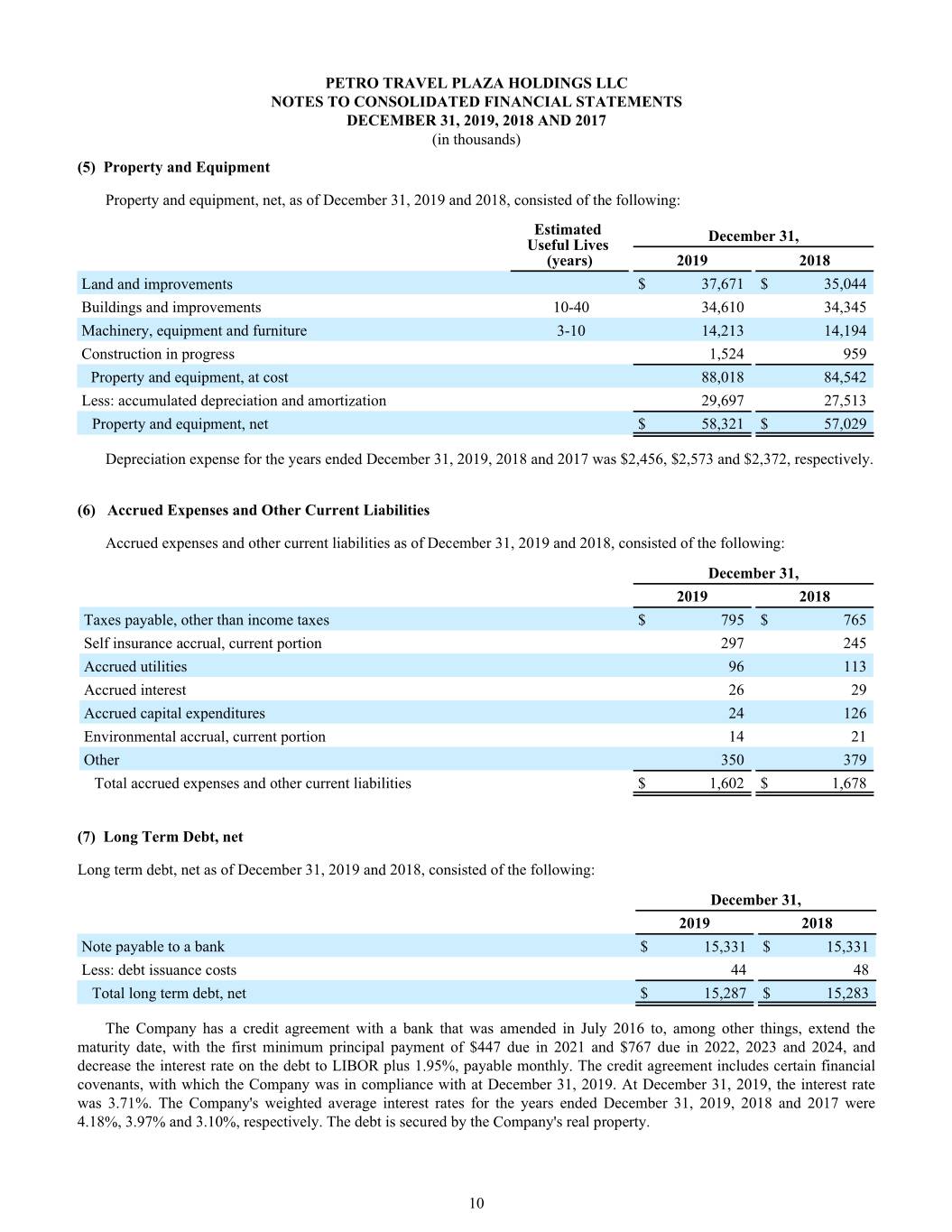 PETRO TRAVEL PLAZA HOLDINGS LLC NOTES TO CONSOLIDATED FINANCIAL STATEMENTS DECEMBER 31, 2019, 2018 AND 2017 (in thousands) (5) Property and Equipment Property and equipment, net, as of December 31, 2019 and 2018, consisted of the following: Estimated December 31, Useful Lives (years) 2019 2018 Land and improvements $ 37,671 $ 35,044 Buildings and improvements 10-40 34,610 34,345 Machinery, equipment and furniture 3-10 14,213 14,194 Construction in progress 1,524 959 Property and equipment, at cost 88,018 84,542 Less: accumulated depreciation and amortization 29,697 27,513 Property and equipment, net $ 58,321 $ 57,029 Depreciation expense for the years ended December 31, 2019, 2018 and 2017 was $2,456, $2,573 and $2,372, respectively. (6) Accrued Expenses and Other Current Liabilities Accrued expenses and other current liabilities as of December 31, 2019 and 2018, consisted of the following: December 31, 2019 2018 Taxes payable, other than income taxes $ 795 $ 765 Self insurance accrual, current portion 297 245 Accrued utilities 96 113 Accrued interest 26 29 Accrued capital expenditures 24 126 Environmental accrual, current portion 14 21 Other 350 379 Total accrued expenses and other current liabilities $ 1,602 $ 1,678 (7) Long Term Debt, net Long term debt, net as of December 31, 2019 and 2018, consisted of the following: December 31, 2019 2018 Note payable to a bank $ 15,331 $ 15,331 Less: debt issuance costs 44 48 Total long term debt, net $ 15,287 $ 15,283 The Company has a credit agreement with a bank that was amended in July 2016 to, among other things, extend the maturity date, with the first minimum principal payment of $447 due in 2021 and $767 due in 2022, 2023 and 2024, and decrease the interest rate on the debt to LIBOR plus 1.95%, payable monthly. The credit agreement includes certain financial covenants, with which the Company was in compliance with at December 31, 2019. At December 31, 2019, the interest rate was 3.71%. The Company's weighted average interest rates for the years ended December 31, 2019, 2018 and 2017 were 4.18%, 3.97% and 3.10%, respectively. The debt is secured by the Company's real property. 10