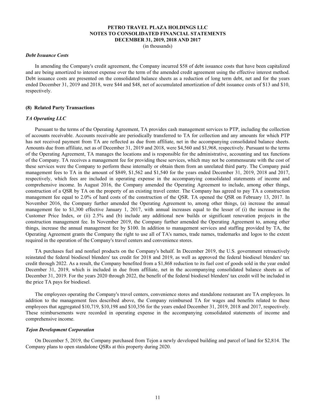 PETRO TRAVEL PLAZA HOLDINGS LLC NOTES TO CONSOLIDATED FINANCIAL STATEMENTS DECEMBER 31, 2019, 2018 AND 2017 (in thousands) Debt Issuance Costs In amending the Company's credit agreement, the Company incurred $58 of debt issuance costs that have been capitalized and are being amortized to interest expense over the term of the amended credit agreement using the effective interest method. Debt issuance costs are presented on the consolidated balance sheets as a reduction of long term debt, net and for the years ended December 31, 2019 and 2018, were $44 and $48, net of accumulated amortization of debt issuance costs of $13 and $10, respectively. (8) Related Party Transactions TA Operating LLC Pursuant to the terms of the Operating Agreement, TA provides cash management services to PTP, including the collection of accounts receivable. Accounts receivable are periodically transferred to TA for collection and any amounts for which PTP has not received payment from TA are reflected as due from affiliate, net in the accompanying consolidated balance sheets. Amounts due from affiliate, net as of December 31, 2019 and 2018, were $4,560 and $1,968, respectively. Pursuant to the terms of the Operating Agreement, TA manages the locations and is responsible for the administrative, accounting and tax functions of the Company. TA receives a management fee for providing these services, which may not be commensurate with the cost of these services were the Company to perform these internally or obtain them from an unrelated third party. The Company paid management fees to TA in the amount of $849, $1,562 and $1,540 for the years ended December 31, 2019, 2018 and 2017, respectively, which fees are included in operating expense in the accompanying consolidated statements of income and comprehensive income. In August 2016, the Company amended the Operating Agreement to include, among other things, construction of a QSR by TA on the property of an existing travel center. The Company has agreed to pay TA a construction management fee equal to 2.0% of hard costs of the construction of the QSR. TA opened the QSR on February 13, 2017. In November 2016, the Company further amended the Operating Agreement to, among other things, (a) increase the annual management fee to $1,300 effective January 1, 2017, with annual increases equal to the lesser of (i) the increase in the Customer Price Index, or (ii) 2.5% and (b) include any additional new builds or significant renovation projects in the construction management fee. In November 2019, the Company further amended the Operating Agreement to, among other things, increase the annual management fee by $100. In addition to management services and staffing provided by TA, the Operating Agreement grants the Company the right to use all of TA's names, trade names, trademarks and logos to the extent required in the operation of the Company's travel centers and convenience stores. TA purchases fuel and nonfuel products on the Company's behalf. In December 2019, the U.S. government retroactively reinstated the federal biodiesel blenders' tax credit for 2018 and 2019, as well as approved the federal biodiesel blenders' tax credit through 2022. As a result, the Company benefited from a $1,868 reduction to its fuel cost of goods sold in the year ended December 31, 2019, which is included in due from affiliate, net in the accompanying consolidated balance sheets as of December 31, 2019. For the years 2020 through 2022, the benefit of the federal biodiesel blenders' tax credit will be included in the price TA pays for biodiesel. The employees operating the Company's travel centers, convenience stores and standalone restaurant are TA employees. In addition to the management fees described above, the Company reimbursed TA for wages and benefits related to these employees that aggregated $10,719, $10,198 and $10,356 for the years ended December 31, 2019, 2018 and 2017, respectively. These reimbursements were recorded in operating expense in the accompanying consolidated statements of income and comprehensive income. Tejon Development Corporation On December 5, 2019, the Company purchased from Tejon a newly developed building and parcel of land for $2,814. The Company plans to open standalone QSRs at this property during 2020. 11