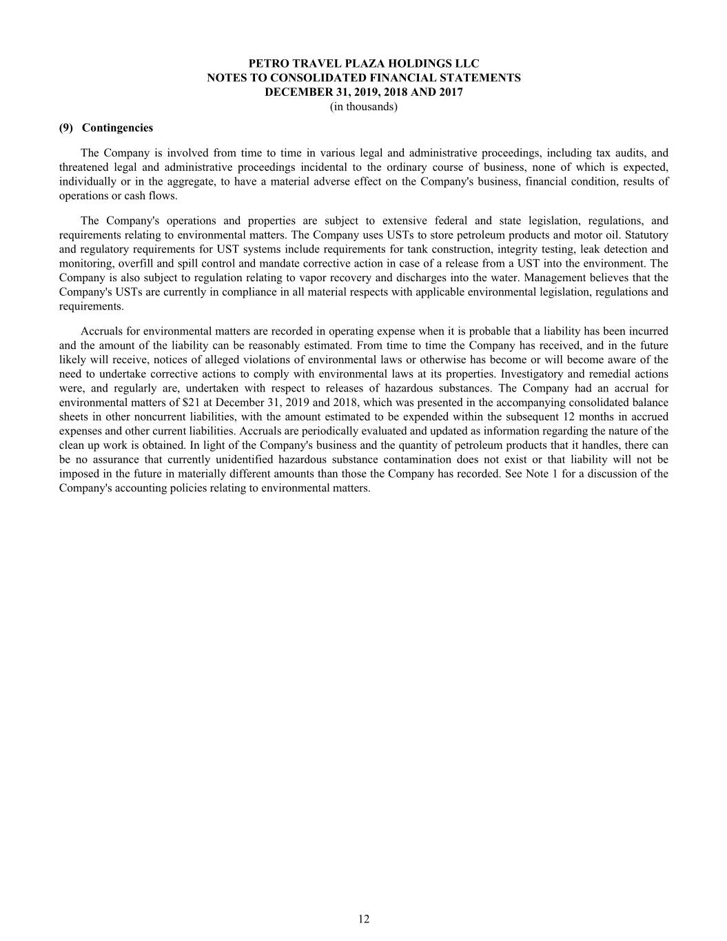 PETRO TRAVEL PLAZA HOLDINGS LLC NOTES TO CONSOLIDATED FINANCIAL STATEMENTS DECEMBER 31, 2019, 2018 AND 2017 (in thousands) (9) Contingencies The Company is involved from time to time in various legal and administrative proceedings, including tax audits, and threatened legal and administrative proceedings incidental to the ordinary course of business, none of which is expected, individually or in the aggregate, to have a material adverse effect on the Company's business, financial condition, results of operations or cash flows. The Company's operations and properties are subject to extensive federal and state legislation, regulations, and requirements relating to environmental matters. The Company uses USTs to store petroleum products and motor oil. Statutory and regulatory requirements for UST systems include requirements for tank construction, integrity testing, leak detection and monitoring, overfill and spill control and mandate corrective action in case of a release from a UST into the environment. The Company is also subject to regulation relating to vapor recovery and discharges into the water. Management believes that the Company's USTs are currently in compliance in all material respects with applicable environmental legislation, regulations and requirements. Accruals for environmental matters are recorded in operating expense when it is probable that a liability has been incurred and the amount of the liability can be reasonably estimated. From time to time the Company has received, and in the future likely will receive, notices of alleged violations of environmental laws or otherwise has become or will become aware of the need to undertake corrective actions to comply with environmental laws at its properties. Investigatory and remedial actions were, and regularly are, undertaken with respect to releases of hazardous substances. The Company had an accrual for environmental matters of $21 at December 31, 2019 and 2018, which was presented in the accompanying consolidated balance sheets in other noncurrent liabilities, with the amount estimated to be expended within the subsequent 12 months in accrued expenses and other current liabilities. Accruals are periodically evaluated and updated as information regarding the nature of the clean up work is obtained. In light of the Company's business and the quantity of petroleum products that it handles, there can be no assurance that currently unidentified hazardous substance contamination does not exist or that liability will not be imposed in the future in materially different amounts than those the Company has recorded. See Note 1 for a discussion of the Company's accounting policies relating to environmental matters. 12