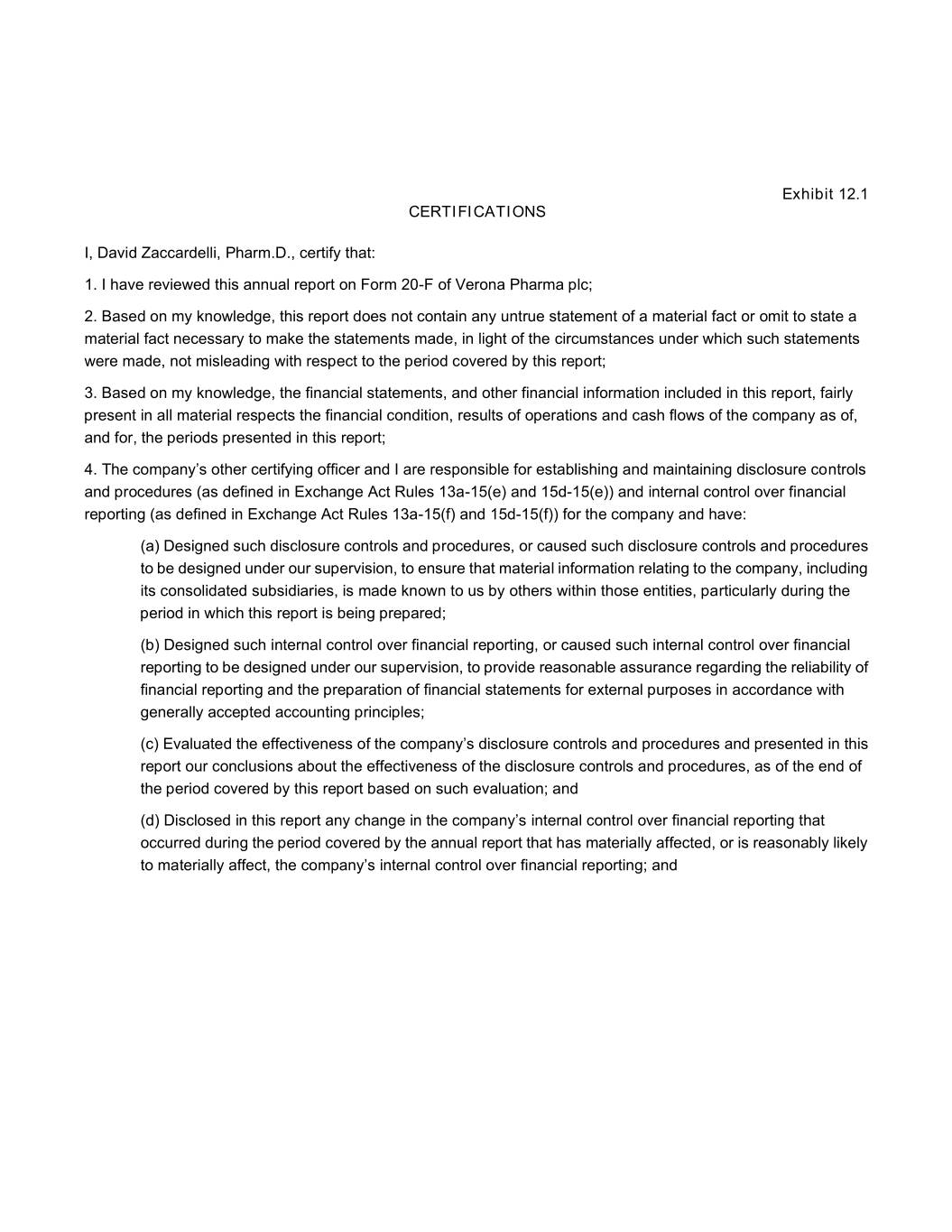 Exhibit 12.1 CERTIFICATIONS I, David Zaccardelli, Pharm.D., certify that: 1. I have reviewed this annual report on Form 20-F of Verona Pharma plc; 2. Based on my knowledge, this report does not contain any untrue statement of a material fact or omit to state a material fact necessary to make the statements made, in light of the circumstances under which such statements were made, not misleading with respect to the period covered by this report; 3. Based on my knowledge, the financial statements, and other financial information included in this report, fairly present in all material respects the financial condition, results of operations and cash flows of the company as of, and for, the periods presented in this report; 4. The company’s other certifying officer and I are responsible for establishing and maintaining disclosure controls and procedures (as defined in Exchange Act Rules 13a-15(e) and 15d-15(e)) and internal control over financial reporting (as defined in Exchange Act Rules 13a-15(f) and 15d-15(f)) for the company and have: (a) Designed such disclosure controls and procedures, or caused such disclosure controls and procedures to be designed under our supervision, to ensure that material information relating to the company, including its consolidated subsidiaries, is made known to us by others within those entities, particularly during the period in which this report is being prepared; (b) Designed such internal control over financial reporting, or caused such internal control over financial reporting to be designed under our supervision, to provide reasonable assurance regarding the reliability of financial reporting and the preparation of financial statements for external purposes in accordance with generally accepted accounting principles; (c) Evaluated the effectiveness of the company’s disclosure controls and procedures and presented in this report our conclusions about the effectiveness of the disclosure controls and procedures, as of the end of the period covered by this report based on such evaluation; and (d) Disclosed in this report any change in the company’s internal control over financial reporting that occurred during the period covered by the annual report that has materially affected, or is reasonably likely to materially affect, the company’s internal control over financial reporting; and