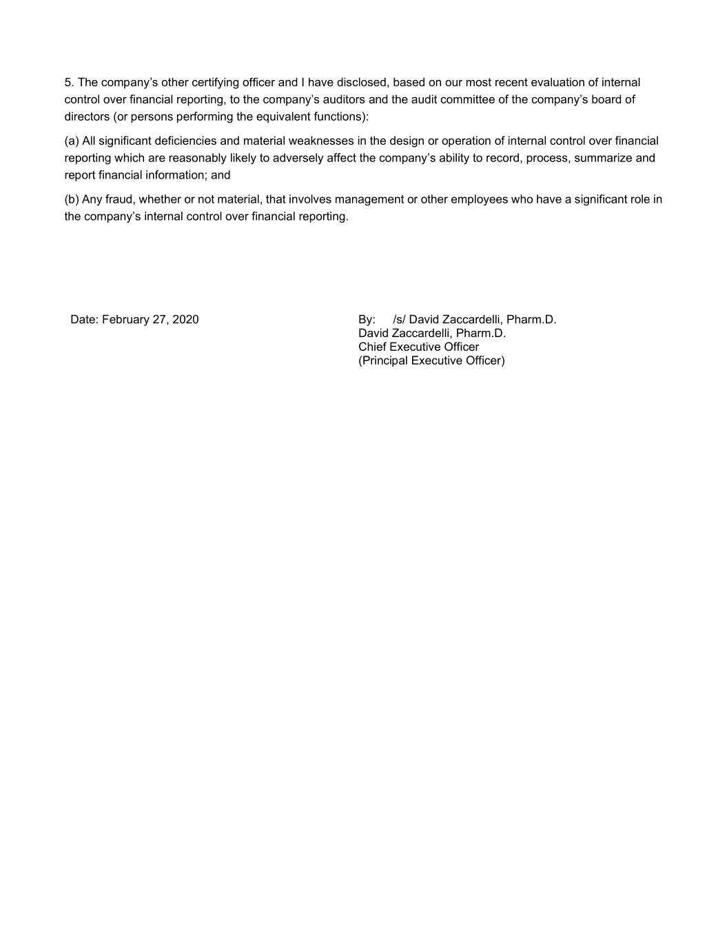 5. The company’s other certifying officer and I have disclosed, based on our most recent evaluation of internal control over financial reporting, to the company’s auditors and the audit committee of the company’s board of directors (or persons performing the equivalent functions): (a) All significant deficiencies and material weaknesses in the design or operation of internal control over financial reporting which are reasonably likely to adversely affect the company’s ability to record, process, summarize and report financial information; and (b) Any fraud, whether or not material, that involves management or other employees who have a significant role in the company’s internal control over financial reporting. Date: February 27, 2020 By: /s/ David Zaccardelli, Pharm.D. David Zaccardelli, Pharm.D. Chief Executive Officer (Principal Executive Officer)