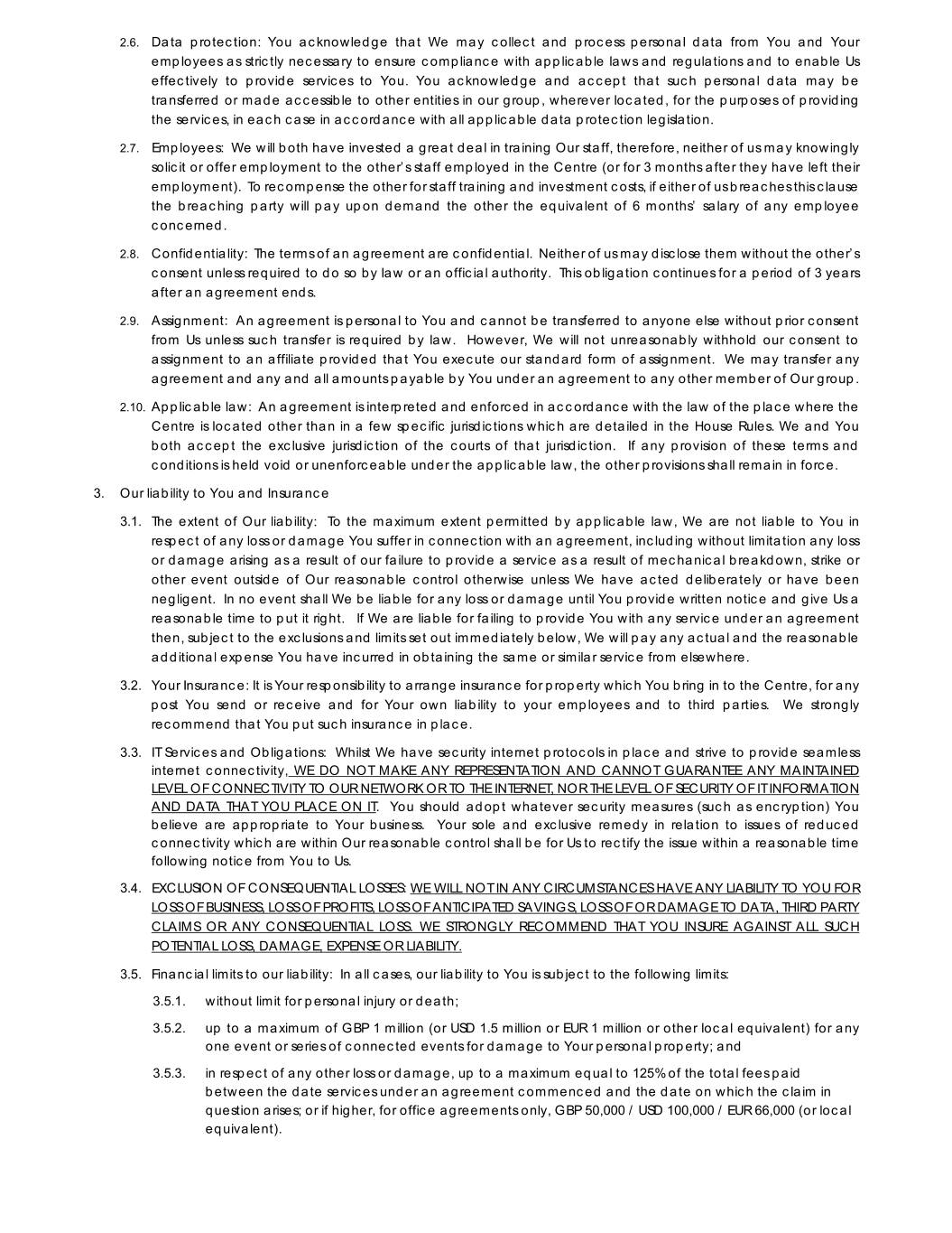 2.6. Data protection: You acknowledge that We may collect and process personal data from You and Your employees as strictly necessary to ensure compliance with applicable laws and regulations and to enable Us effectively to provide services to You. You acknowledge and accept that such personal data may be transferred or made accessible to other entities in our group, wherever located, for the purposes of providing the services, in each case in accordance with all applicable data protection legislation. 2.7. Employees: We will both have invested a great deal in training Our staff, therefore, neither of us may knowingly solicit or offer employment to the other’s staff employed in the Centre (or for 3 months after they have left their employment). To recompense the other for staff training and investment costs, if either of us breaches this clause the breaching party will pay upon demand the other the equivalent of 6 months’ salary of any employee concerned. 2.8. Confidentiality: The terms of an agreement are confidential. Neither of us may disclose them without the other’s consent unless required to do so by law or an official authority. This obligation continues for a period of 3 years after an agreement ends. 2.9. Assignment: An agreement is personal to You and cannot be transferred to anyone else without prior consent from Us unless such transfer is required by law. However, We will not unreasonably withhold our consent to assignment to an affiliate provided that You execute our standard form of assignment. We may transfer any agreement and any and all amounts payable by You under an agreement to any other member of Our group. 2.10. Applicable law: An agreement is interpreted and enforced in accordance with the law of the place where the Centre is located other than in a few specific jurisdictions which are detailed in the House Rules. We and You both accept the exclusive jurisdiction of the courts of that jurisdiction. If any provision of these terms and conditions is held void or unenforceable under the applicable law, the other provisions shall remain in force. 3. Our liability to You and Insurance 3.1. The extent of Our liability: To the maximum extent permitted by applicable law, We are not liable to You in respect of any loss or damage You suffer in connection with an agreement, including without limitation any loss or damage arising as a result of our failure to provide a service as a result of mechanical breakdown, strike or other event outside of Our reasonable control otherwise unless We have acted deliberately or have been negligent. In no event shall We be liable for any loss or damage until You provide written notice and give Us a reasonable time to put it right. If We are liable for failing to provide You with any service under an agreement then, subject to the exclusions and limits set out immediately below, We will pay any actual and the reasonable additional expense You have incurred in obtaining the same or similar service from elsewhere. 3.2. Your Insurance: It is Your responsibility to arrange insurance for property which You bring in to the Centre, for any post You send or receive and for Your own liability to your employees and to third parties. We strongly recommend that You put such insurance in place. 3.3. IT Services and Obligations: Whilst We have security internet protocols in place and strive to provide seamless internet connectivity, WE DO NOT MAKE ANY REPRESENTATION AND CANNOT GUARANTEE ANY MAINTAINED LEVEL OF CONNECTIVITY TO OUR NETWORK OR TO THE INTERNET, NOR THE LEVEL OF SECURITY OF IT INFORMATION AND DATA THAT YOU PLACE ON IT. You should adopt whatever security measures (such as encryption) You believe are appropriate to Your business. Your sole and exclusive remedy in relation to issues of reduced connectivity which are within Our reasonable control shall be for Us to rectify the issue within a reasonable time following notice from You to Us. 3.4. EXCLUSION OF CONSEQUENTIAL LOSSES: WE WILL NOT IN ANY CIRCUMSTANCES HAVE ANY LIABILITY TO YOU FOR LOSS OF BUSINESS, LOSS OF PROFITS, LOSS OF ANTICIPATED SAVINGS, LOSS OF OR DAMAGE TO DATA, THIRD PARTY CLAIMS OR ANY CONSEQUENTIAL LOSS. WE STRONGLY RECOMMEND THAT YOU INSURE AGAINST ALL SUCH POTENTIAL LOSS, DAMAGE, EXPENSE OR LIABILITY. 3.5. Financial limits to our liability: In all cases, our liability to You is subject to the following limits: 3.5.1. without limit for personal injury or death; 3.5.2. up to a maximum of GBP 1 million (or USD 1.5 million or EUR 1 million or other local equivalent) for any one event or series of connected events for damage to Your personal property; and 3.5.3. in respect of any other loss or damage, up to a maximum equal to 125% of the total fees paid between the date services under an agreement commenced and the date on which the claim in question arises; or if higher, for office agreements only, GBP 50,000 / USD 100,000 / EUR 66,000 (or local equivalent).
