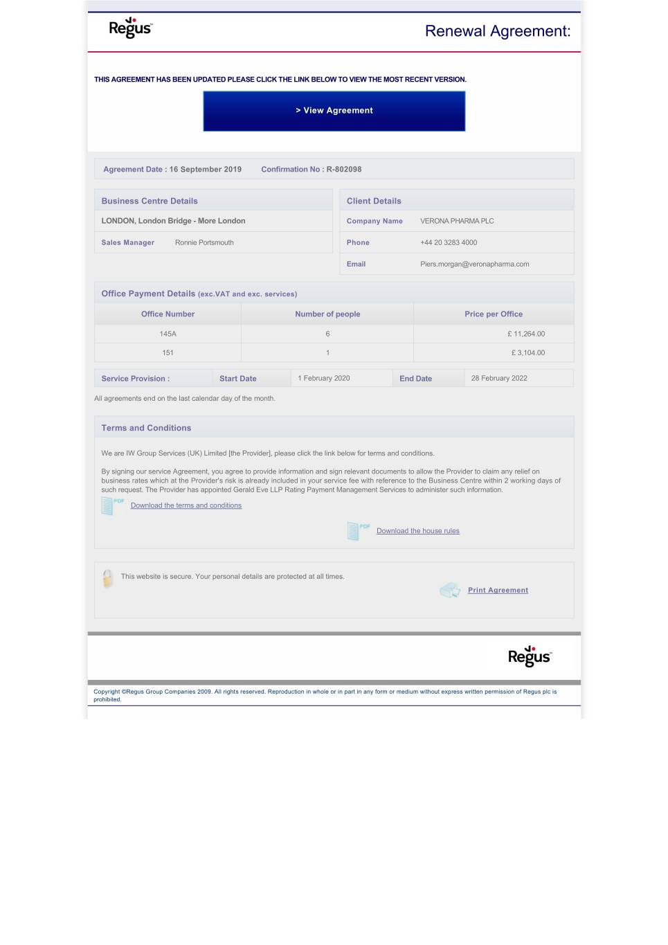 Renewal Agreement: THIS AGREEMENT HAS BEEN UPDATED PLEASE CLICK THE LINK BELOW TO VIEW THE MOST RECENT VERSION. > View Agreement Agreement Date : 16 September 2019 Confirmation No : R­802098   Business Centre Details Client Details LONDON, London Bridge ­ More London Company Name VERONA PHARMA PLC Sales Manager Ronnie Portsmouth Phone +44 20 3283 4000 Email Piers.morgan@veronapharma.com Office Payment Details (exc.VAT and exc. services) Office Number Number of people Price per Office 145A 6 £ 11,264.00 151 1 £ 3,104.00 Service Provision : Start Date 1 February 2020 End Date 28 February 2022 All agreements end on the last calendar day of the month. Terms and Conditions We are IW Group Services (UK) Limited [the Provider], please click the link below for terms and conditions. By signing our service Agreement, you agree to provide information and sign relevant documents to allow the Provider to claim any relief on business rates which at the Provider's risk is already included in your service fee with reference to the Business Centre within 2 working days of such request. The Provider has appointed Gerald Eve LLP Rating Payment Management Services to administer such information. Download the terms and conditions Download the house rules This website is secure. Your personal details are protected at all times. Print Agreement Copyright ©Regus Group Companies 2009. All rights reserved. Reproduction in whole or in part in any form or medium without express written permission of Regus plc is prohibited.