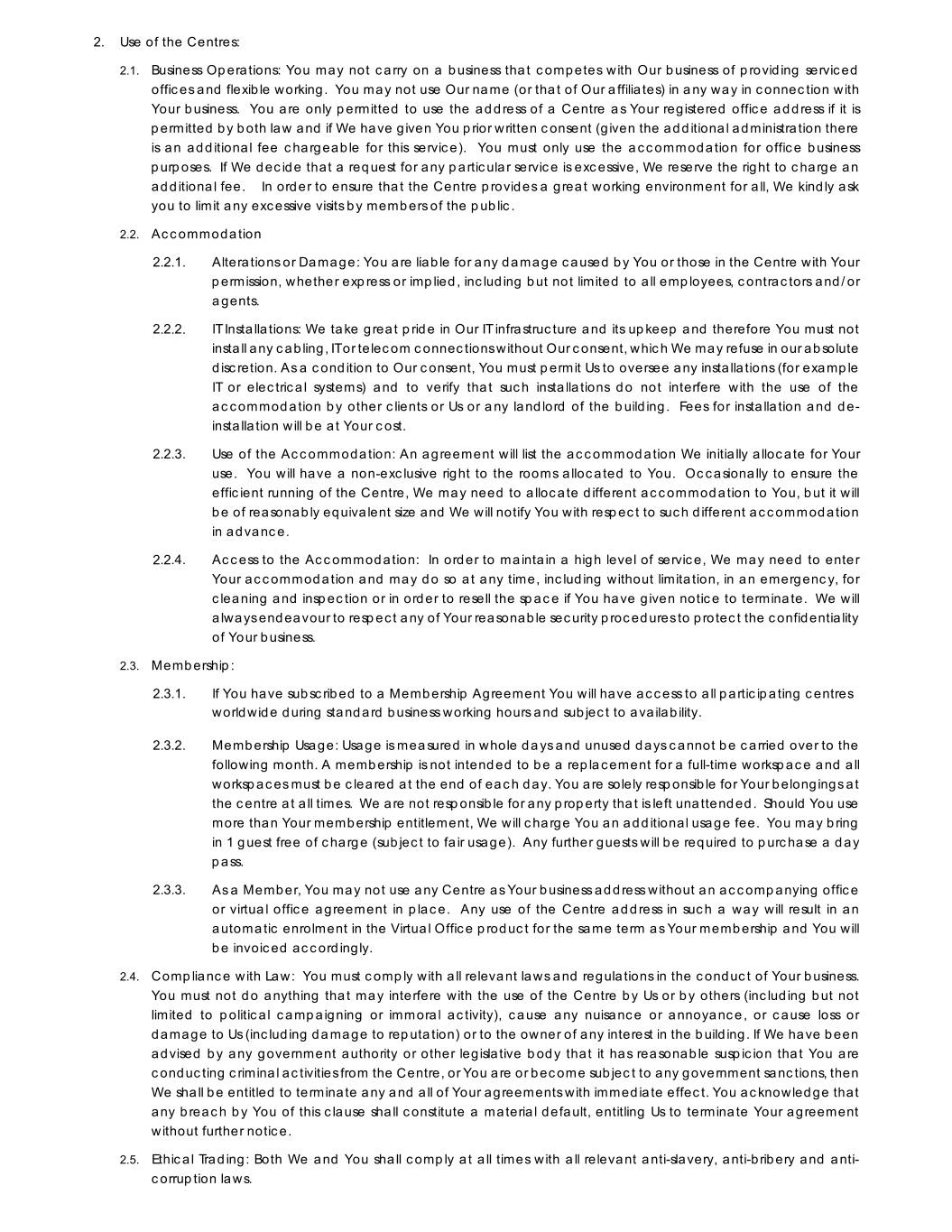 2. Use of the Centres: 2.1. Business Operations: You may not carry on a business that competes with Our business of providing serviced offices and flexible working. You may not use Our name (or that of Our affiliates) in any way in connection with Your business. You are only permitted to use the address of a Centre as Your registered office address if it is permitted by both law and if We have given You prior written consent (given the additional administration there is an additional fee chargeable for this service). You must only use the accommodation for office business purposes. If We decide that a request for any particular service is excessive, We reserve the right to charge an additional fee. In order to ensure that the Centre provides a great working environment for all, We kindly ask you to limit any excessive visits by members of the public. 2.2. Accommodation 2.2.1. Alterations or Damage: You are liable for any damage caused by You or those in the Centre with Your permission, whether express or implied, including but not limited to all employees, contractors and/or agents. 2.2.2. IT Installations: We take great pride in Our IT infrastructure and its upkeep and therefore You must not install any cabling, IT or telecom connections without Our consent, which We may refuse in our absolute discretion. As a condition to Our consent, You must permit Us to oversee any installations (for example IT or electrical systems) and to verify that such installations do not interfere with the use of the accommodation by other clients or Us or any landlord of the building. Fees for installation and de- installation will be at Your cost. 2.2.3. Use of the Accommodation: An agreement will list the accommodation We initially allocate for Your use. You will have a non-exclusive right to the rooms allocated to You. Occasionally to ensure the efficient running of the Centre, We may need to allocate different accommodation to You, but it will be of reasonably equivalent size and We will notify You with respect to such different accommodation in advance. 2.2.4. Access to the Accommodation: In order to maintain a high level of service, We may need to enter Your accommodation and may do so at any time, including without limitation, in an emergency, for cleaning and inspection or in order to resell the space if You have given notice to terminate. We will always endeavour to respect any of Your reasonable security procedures to protect the confidentiality of Your business. 2.3. Membership: 2.3.1. If You have subscribed to a Membership Agreement You will have access to all participating centres worldwide during standard business working hours and subject to availability. 2.3.2. Membership Usage: Usage is measured in whole days and unused days cannot be carried over to the following month. A membership is not intended to be a replacement for a full-time workspace and all workspaces must be cleared at the end of each day. You are solely responsible for Your belongings at the centre at all times. We are not responsible for any property that is left unattended. Should You use more than Your membership entitlement, We will charge You an additional usage fee. You may bring in 1 guest free of charge (subject to fair usage). Any further guests will be required to purchase a day pass. 2.3.3. As a Member, You may not use any Centre as Your business address without an accompanying office or virtual office agreement in place. Any use of the Centre address in such a way will result in an automatic enrolment in the Virtual Office product for the same term as Your membership and You will be invoiced accordingly. 2.4. Compliance with Law: You must comply with all relevant laws and regulations in the conduct of Your business. You must not do anything that may interfere with the use of the Centre by Us or by others (including but not limited to political campaigning or immoral activity), cause any nuisance or annoyance, or cause loss or damage to Us (including damage to reputation) or to the owner of any interest in the building. If We have been advised by any government authority or other legislative body that it has reasonable suspicion that You are conducting criminal activities from the Centre, or You are or become subject to any government sanctions, then We shall be entitled to terminate any and all of Your agreements with immediate effect. You acknowledge that any breach by You of this clause shall constitute a material default, entitling Us to terminate Your agreement without further notice. 2.5. Ethical Trading: Both We and You shall comply at all times with all relevant anti-slavery, anti-bribery and anti- corruption laws.