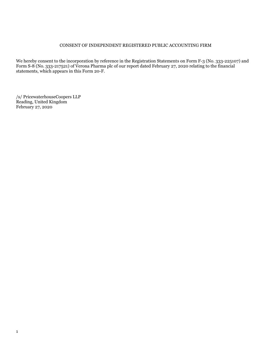 CONSENT OF INDEPENDENT REGISTERED PUBLIC ACCOUNTING FIRM We hereby consent to the incorporation by reference in the Registration Statements on Form F-3 (No. 333-225107) and Form S-8 (No. 333-217521) of Verona Pharma plc of our report dated February 27, 2020 relating to the financial statements, which appears in this Form 20-F. /s/ PricewaterhouseCoopers LLP Reading, United Kingdom February 27, 2020 1